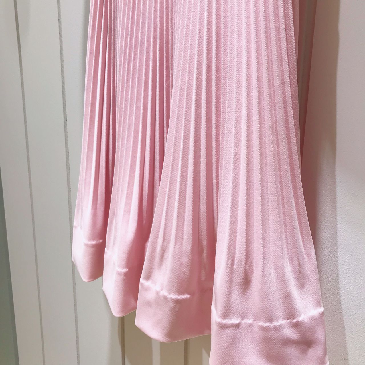 ニットジャージー素材のワンピースは柔らかなピンク色です。