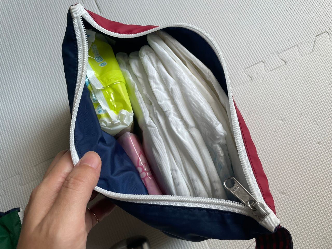 大きいポーチには、おむつ関連アイテムをまとめて入れています。