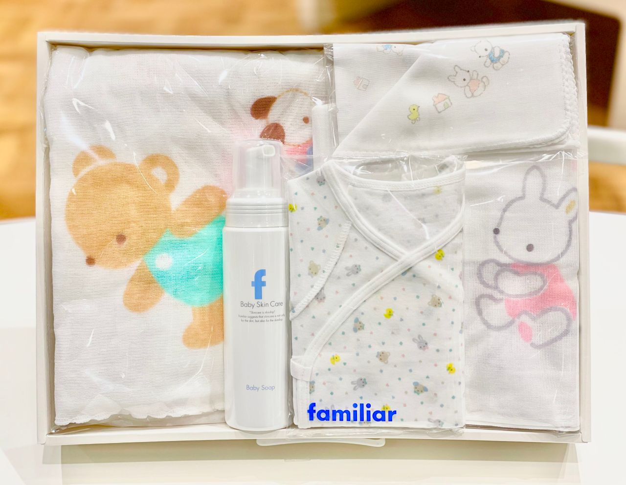 おぼろバスタオル・おぼろフェイスタオル・ガーゼハンカチ(2枚組)・打合せ半袖肌着・ベビーソープの5点セットです。