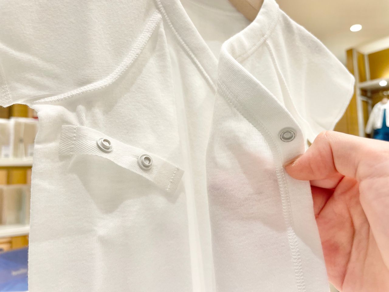 ①外側の打合せがスナップボタンになり、よりスムーズにお着替えさせやすくなりました。