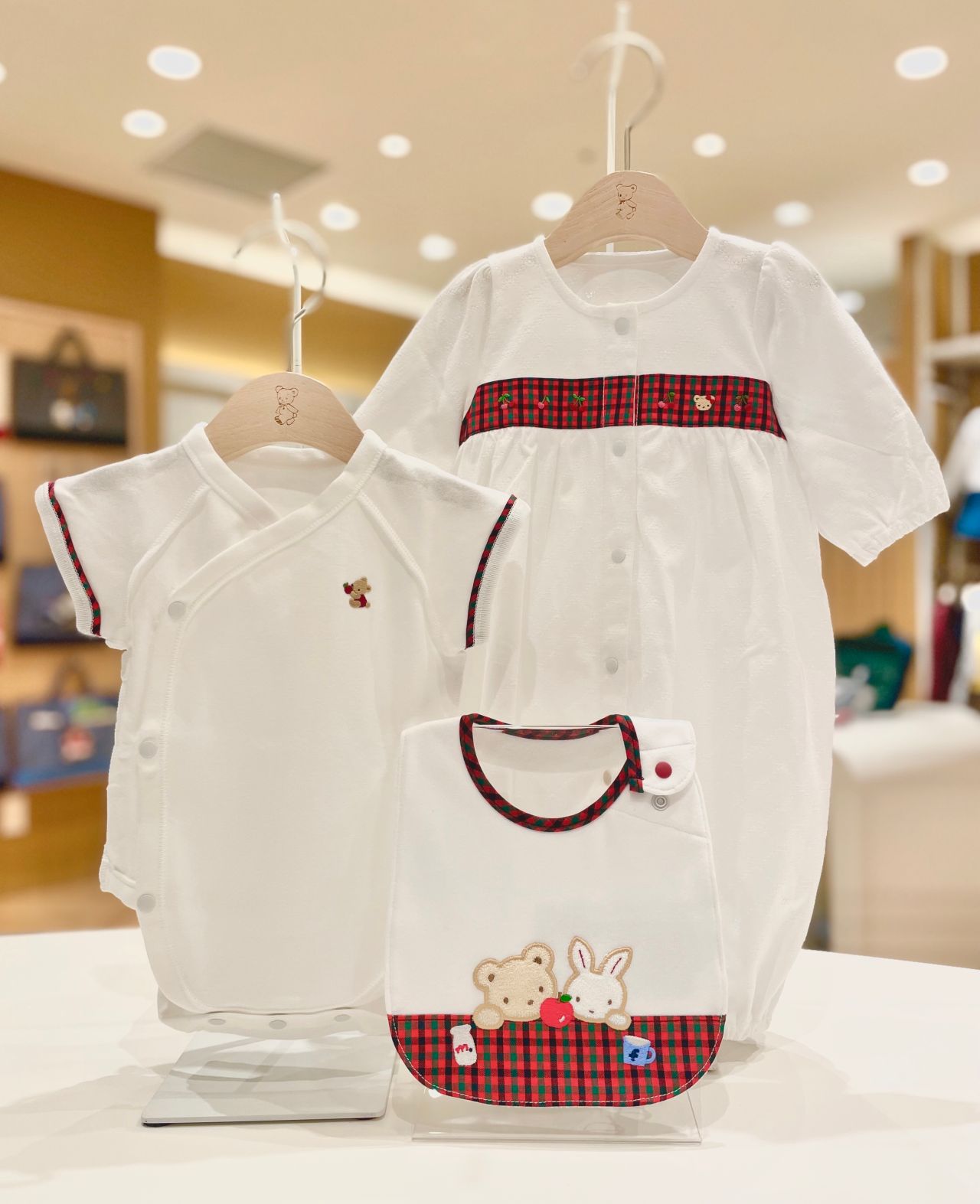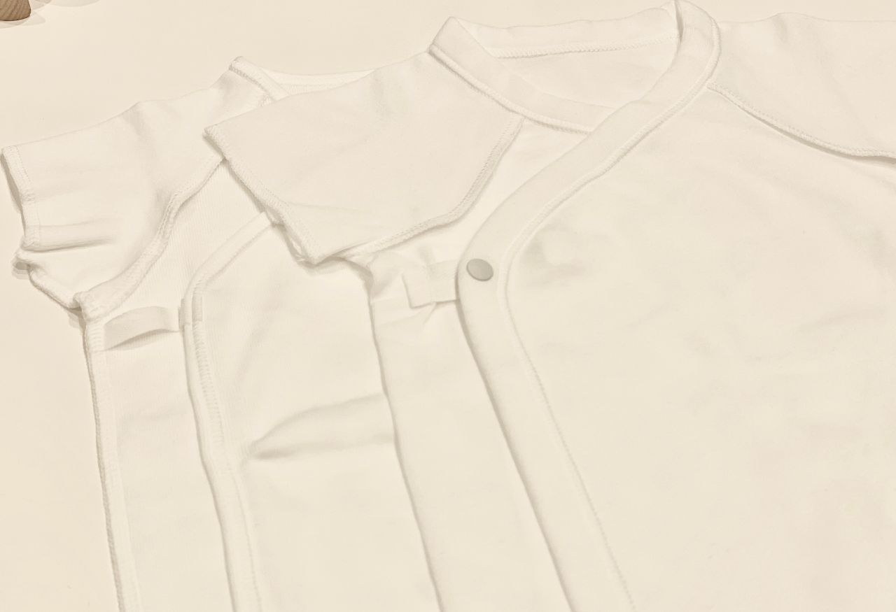 春夏生まれさんにおすすめの、ツーウェイオール・ロンパス型肌着・よだれかけの3点セットです。