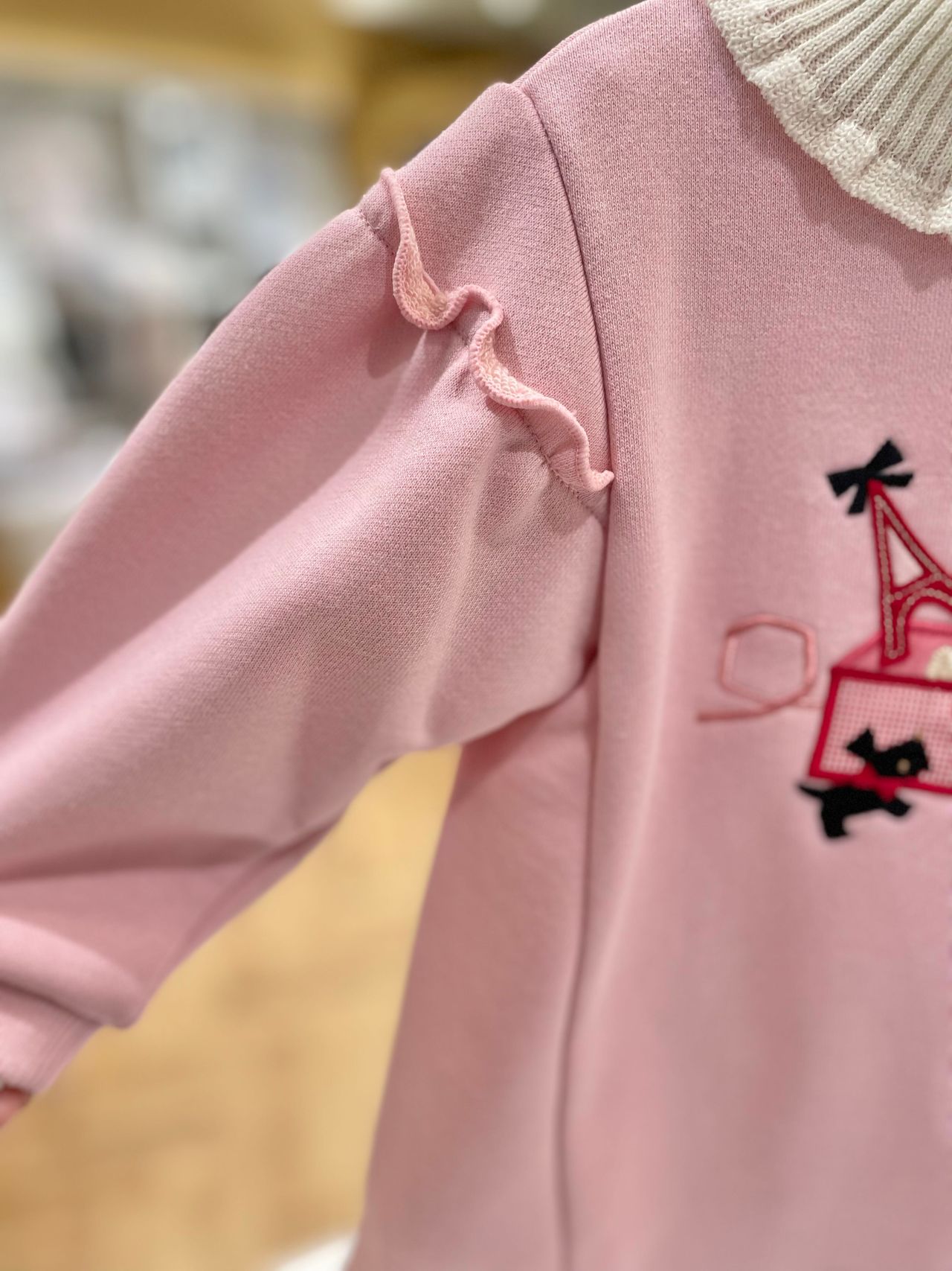 袖の切り替えにフリルを施しており、ピンク色で可愛らしい仕上げになっています。