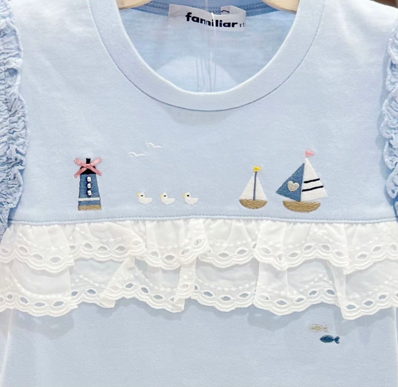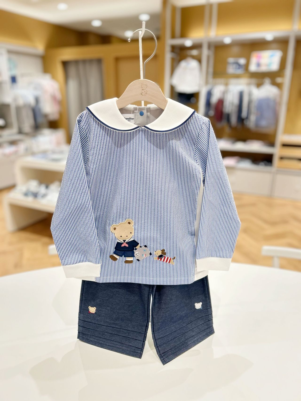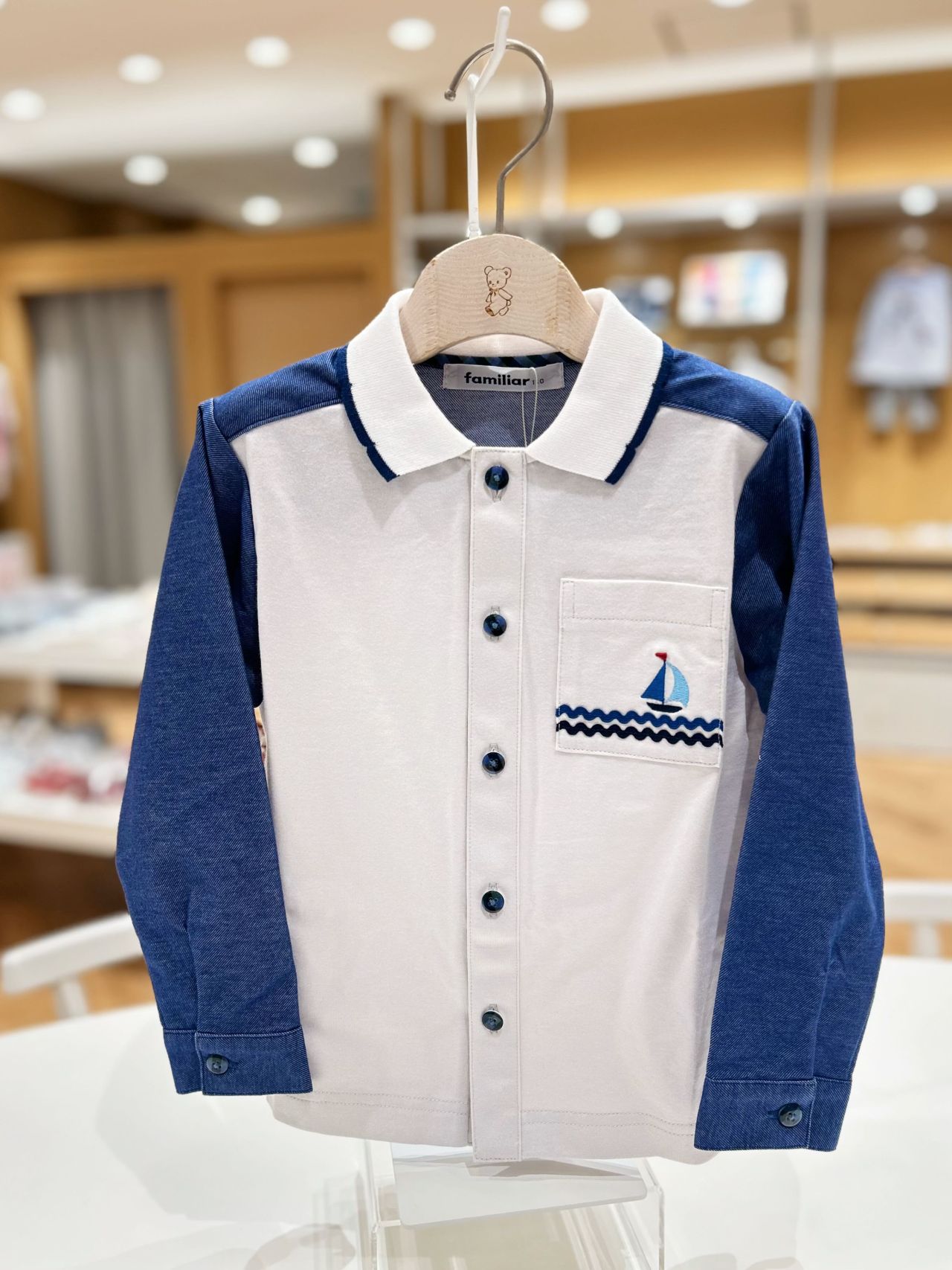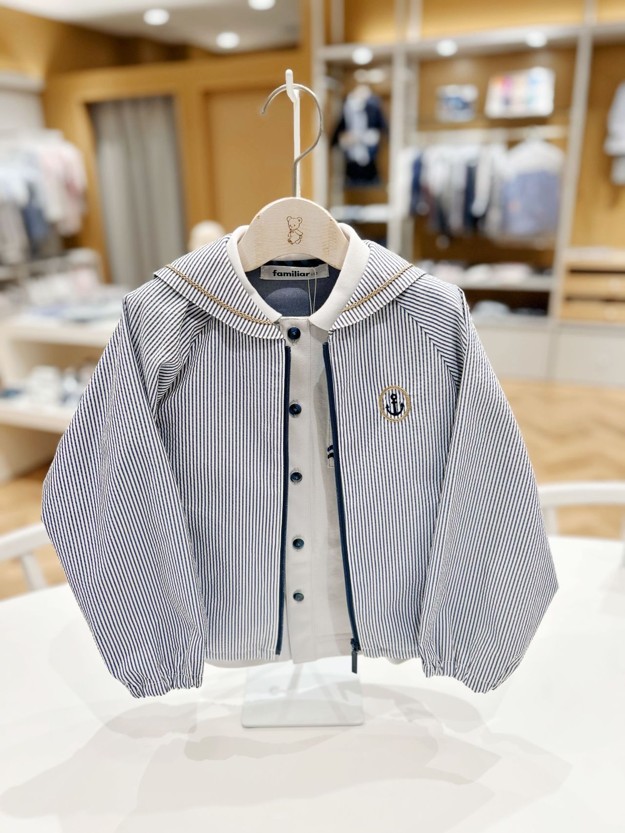 セーラー襟とブルーのストライプ生地が爽やかな印象のシャツ。