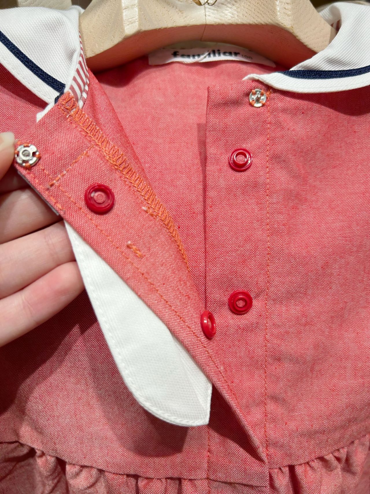 ダンガリーのジャンパースカートはポリエステル混でお手入れしやすい素材。