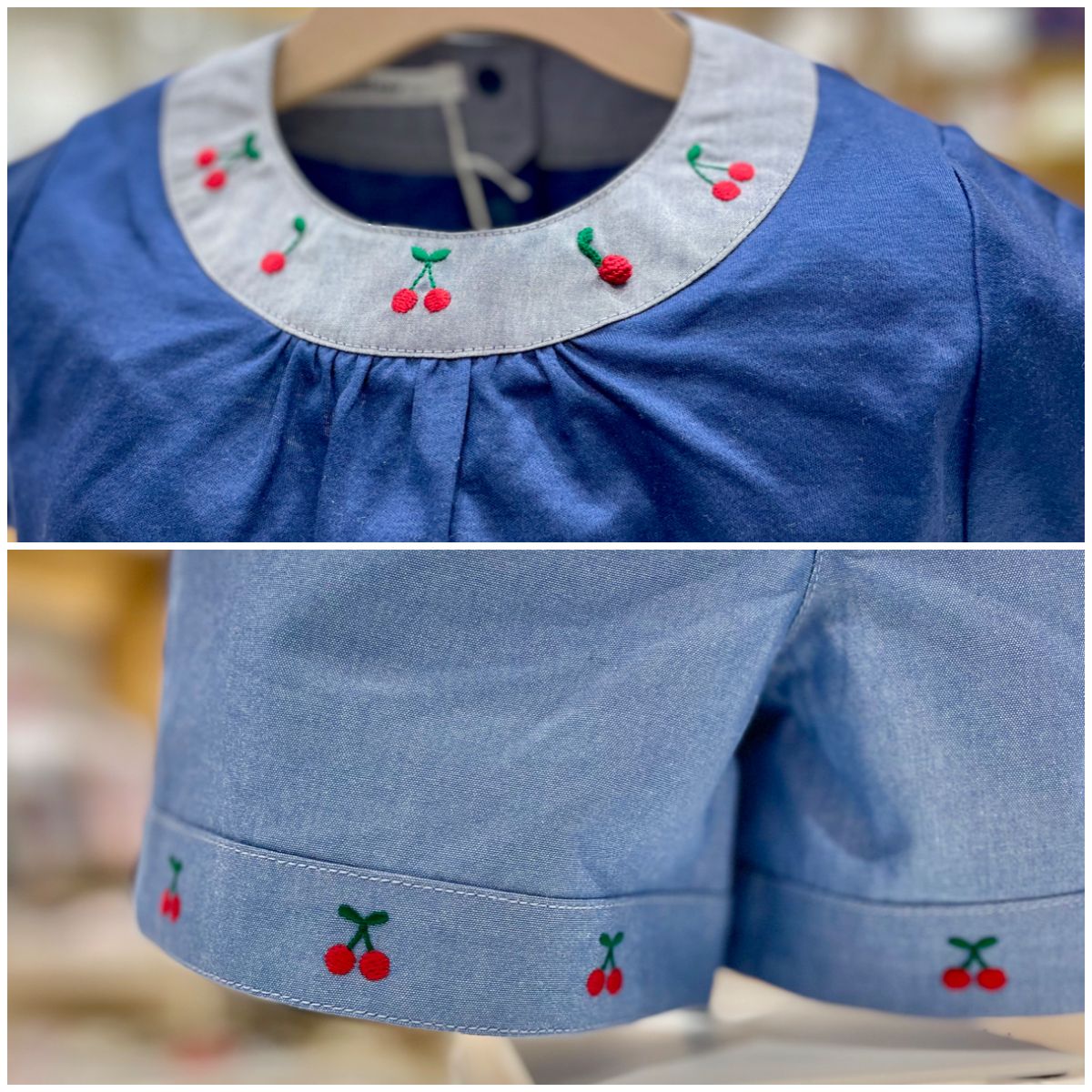 Tシャツの襟ぐりとキュロットに使用しているダンガリー素材はファミリア別注で、光沢感が特徴です。