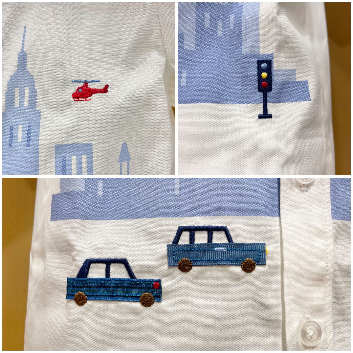 シャツをよく見てみると、ヘリコプターや信号機や車が刺繍になっています。