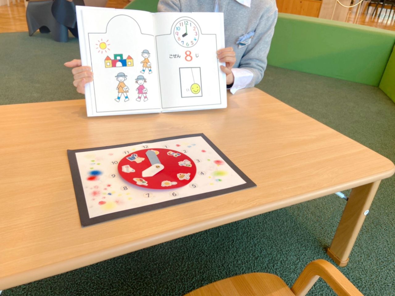 出来上がったお気に入りの時計で、数や時間に親しみながら遊んでみましょう。