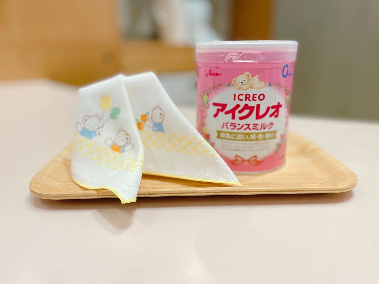 お土産:アイクレオミルク缶320g、ガーゼハンカチ