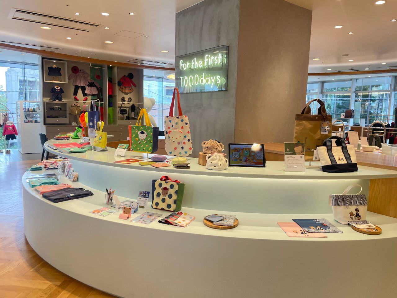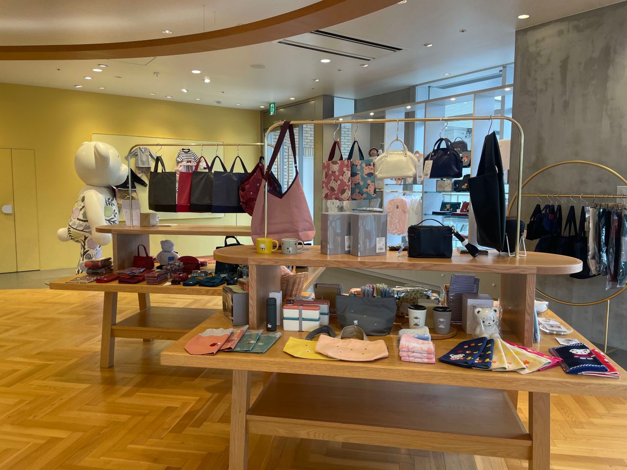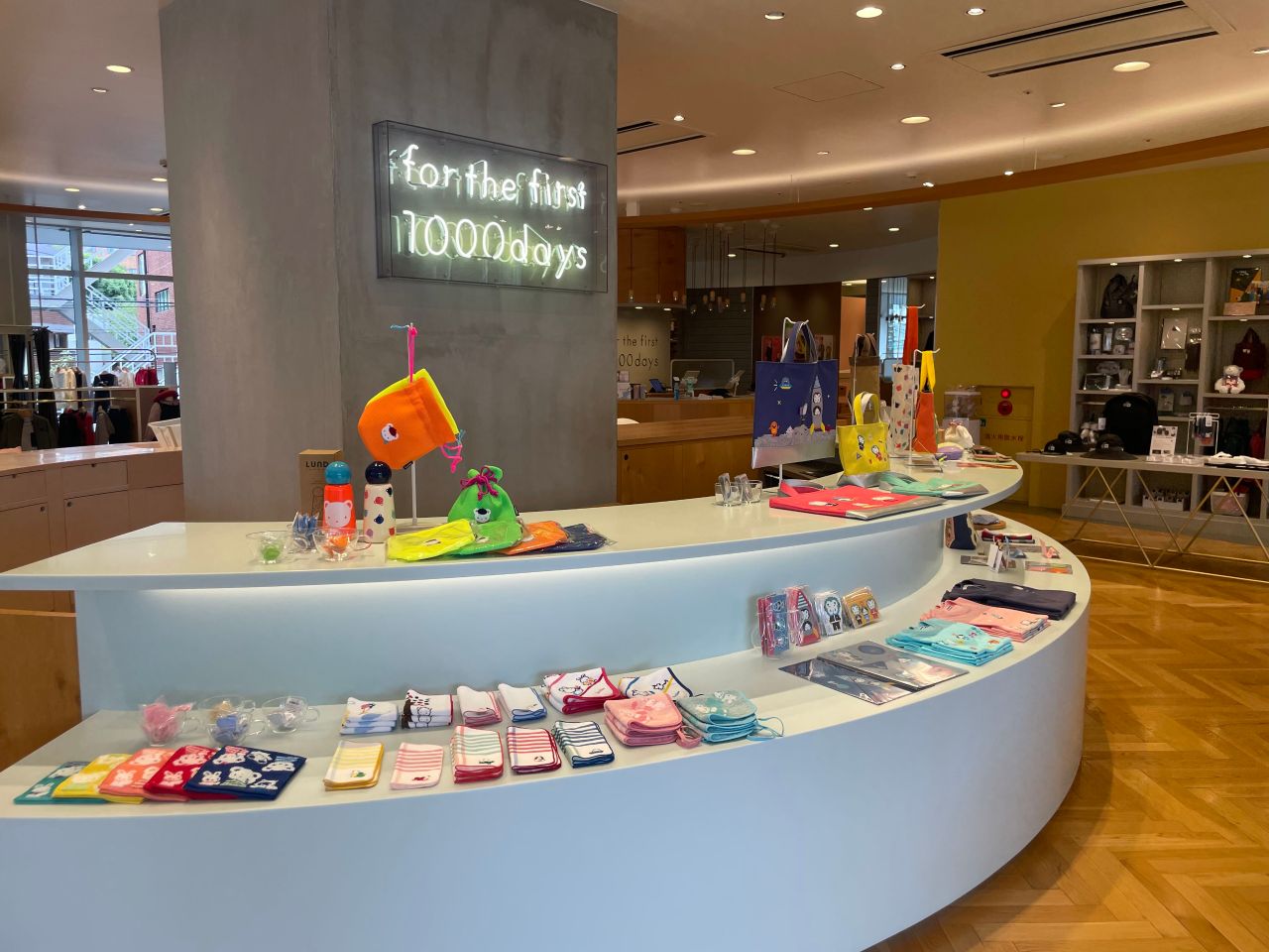ここには、大人が使えるタオルハンカチやバッグなどの雑貨が中心に
