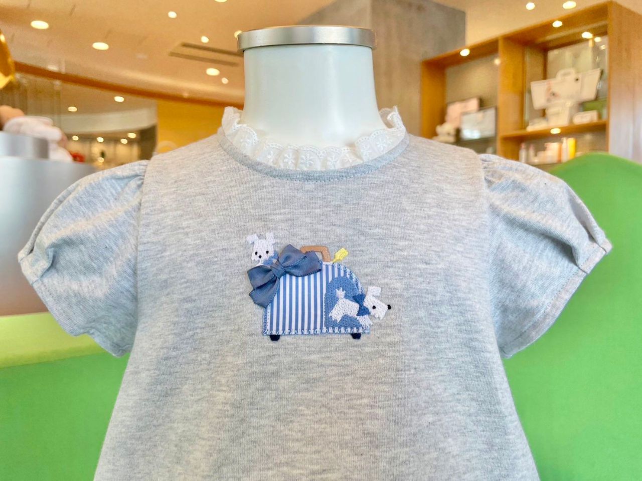 胸元の刺繍には、おでかけから帰ってきてキャリーケースから出てきたワンちゃんたちとクマちゃんが遊んでいるシーンが描かれています。