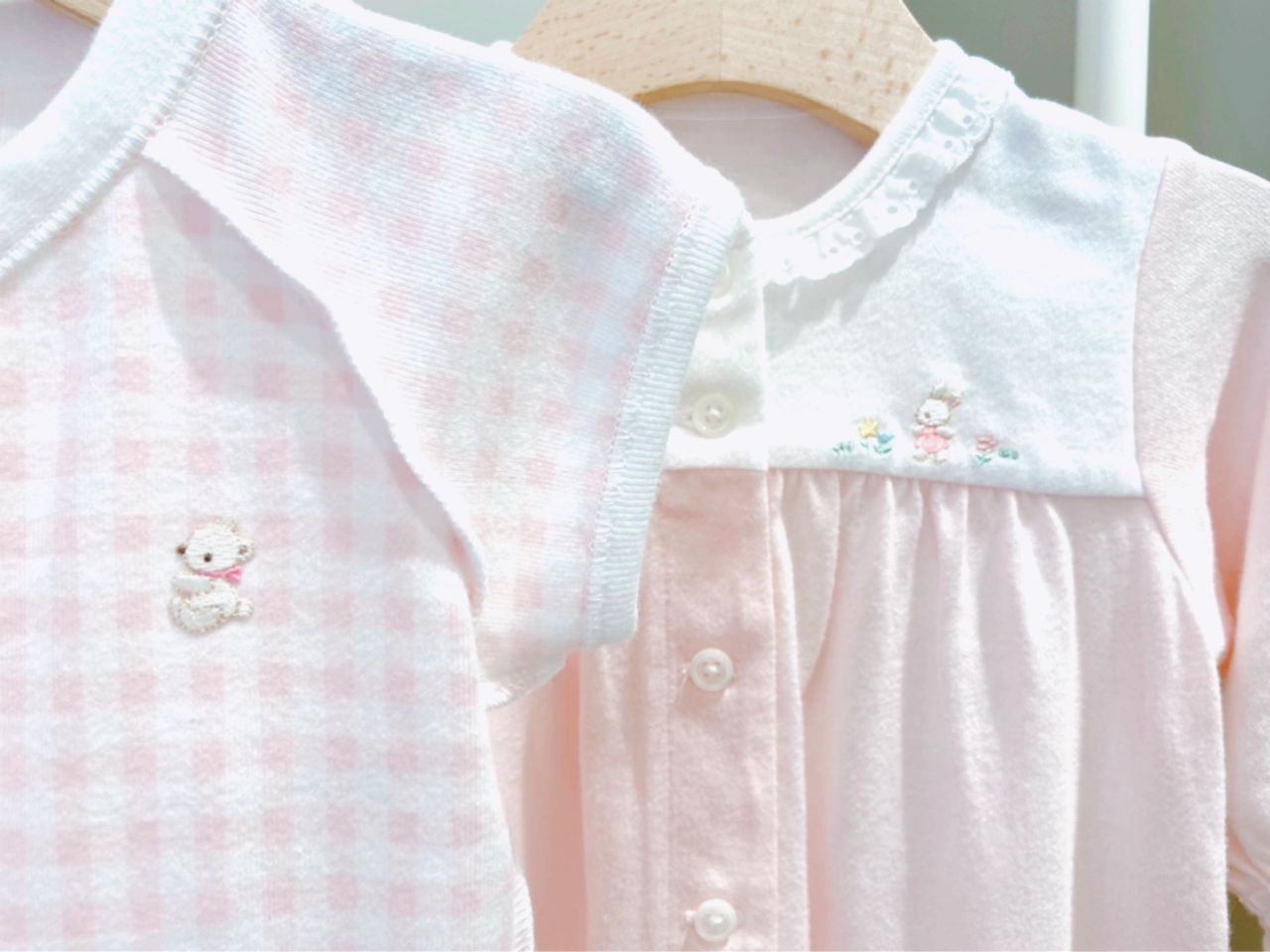 新生児の時期はあっという間に過ぎてしまいます。かわいい刺繍やプリントの肌着もご用意しております。