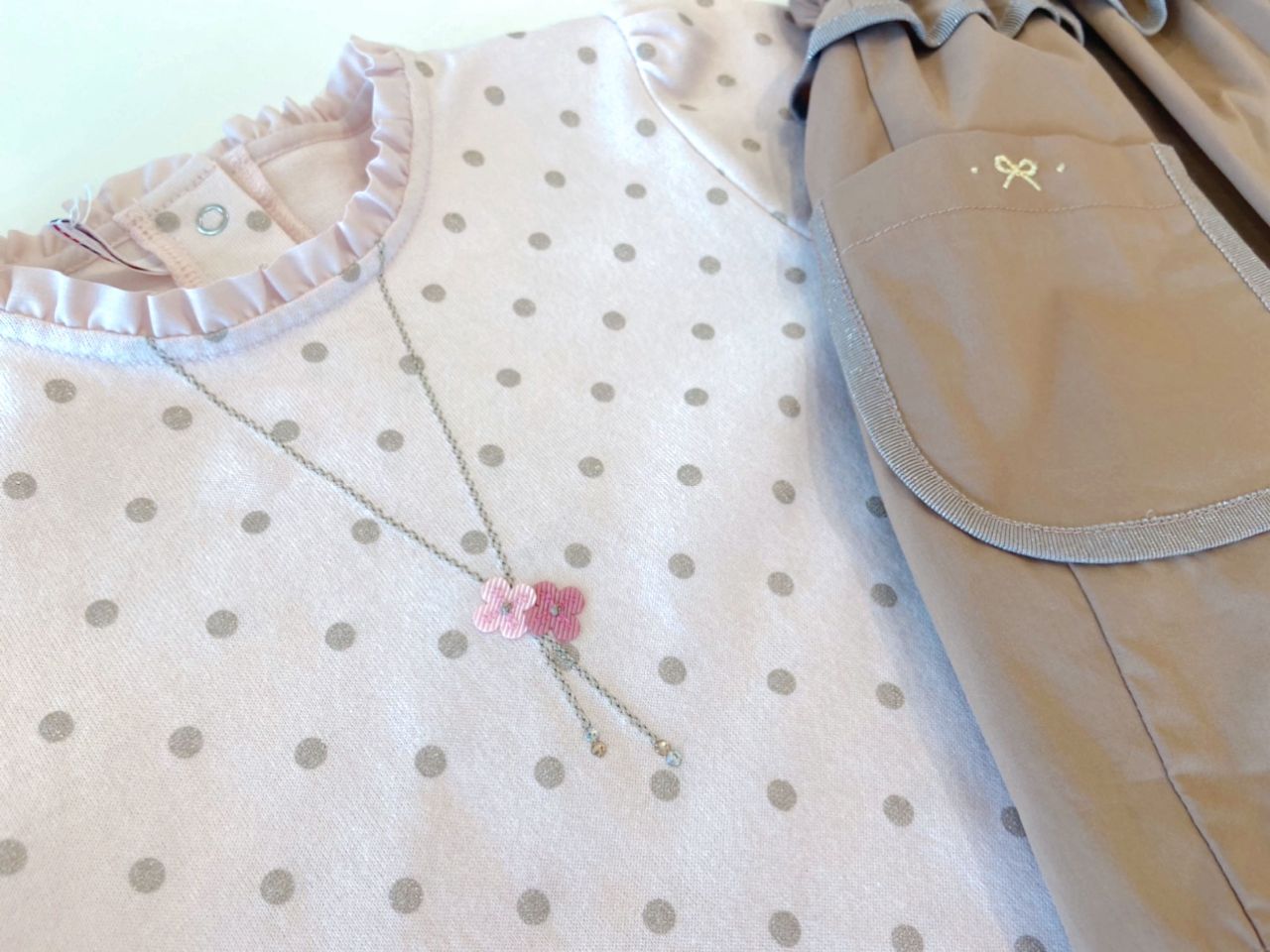 淡いピンクの生地にラメの水玉模様がプリントされた女の子らしいデザインのTシャツ。