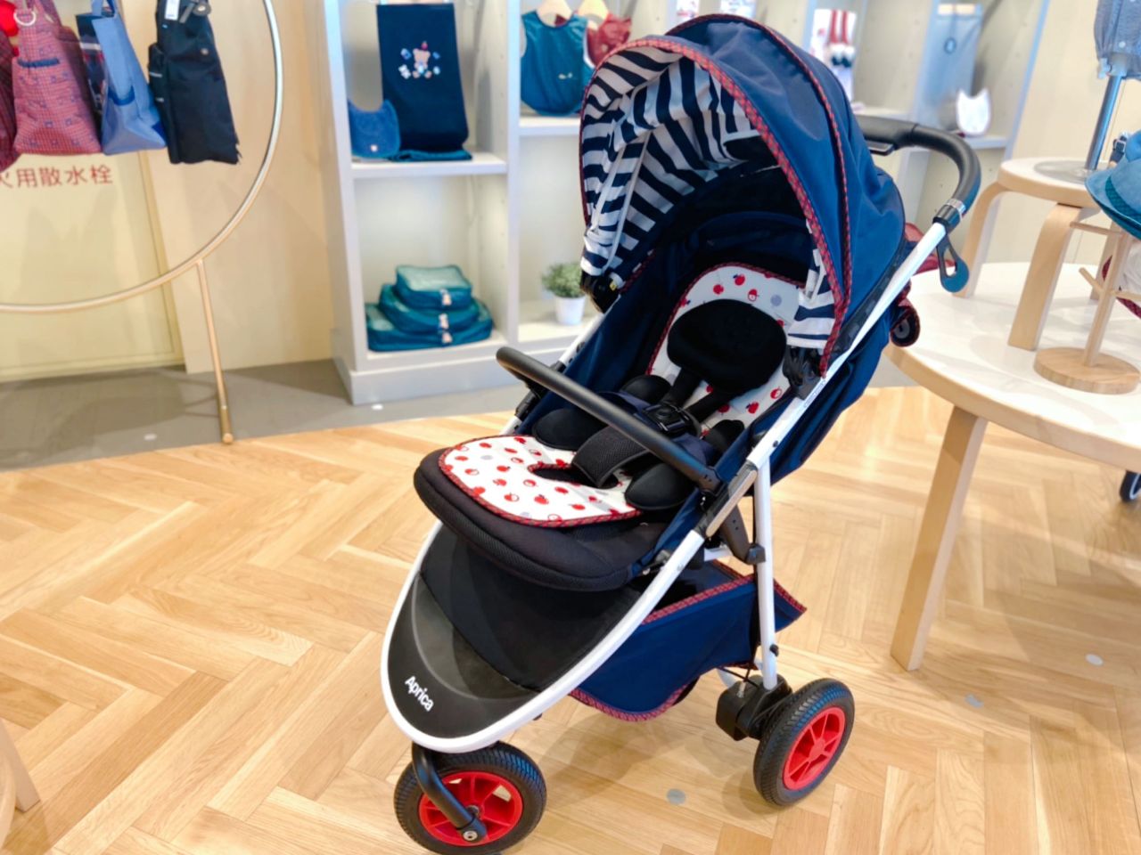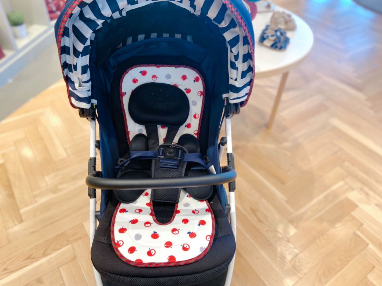 ファミリア×アップリカのコラボベビーカーと、オプションパーツの汗取りマットのセット。