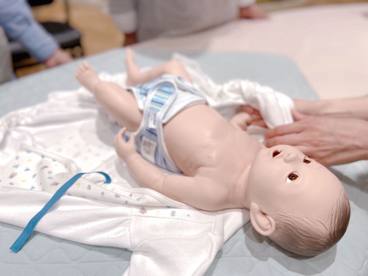 あかちゃんが生まれたら、上手にお着替えさせてあげられるかな?そんな不安を今のうちに解消!新生児のお人形を使って、肌着やウェアの着せ方を体験していただけます。