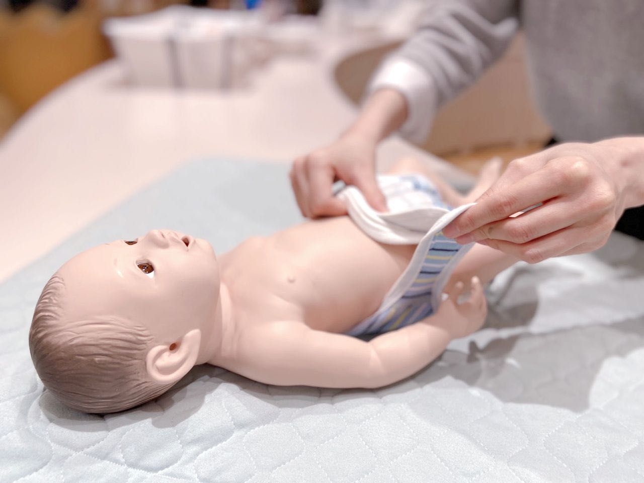 あかちゃんとの大事なスキンシップの時間でもあるおむつ替え。新生児のお人形を使って、布おむつのあてかたを体験していただけます。