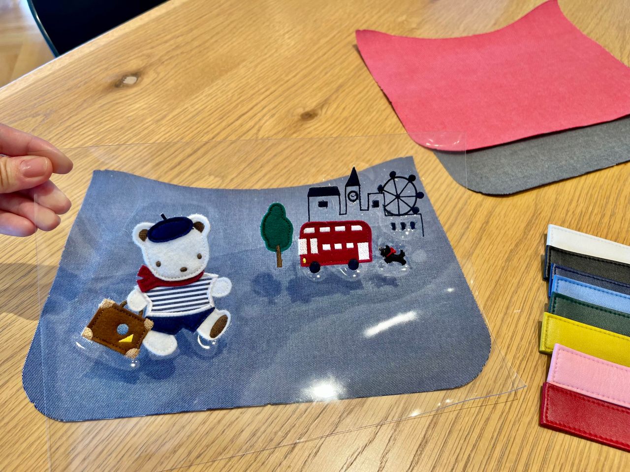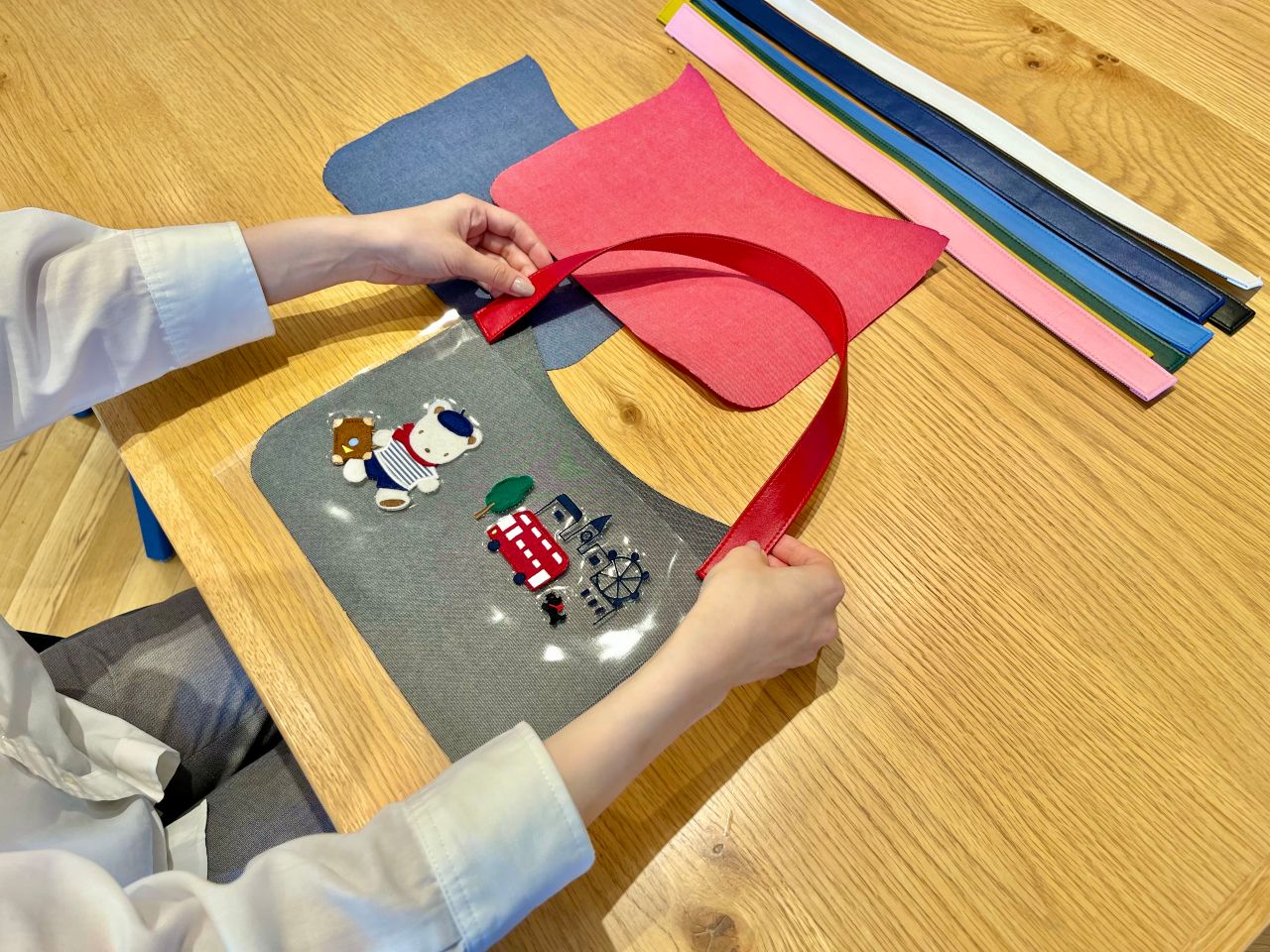 Fショー限定のロンドン柄を生地に当てながら