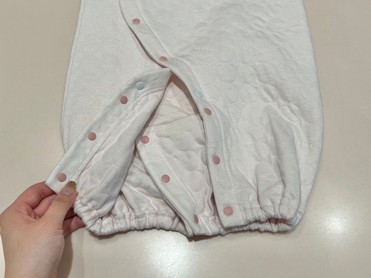 スナップの留め替えによって、ベビー服とカバーオールの2通りの使い方ができるお洋服です。