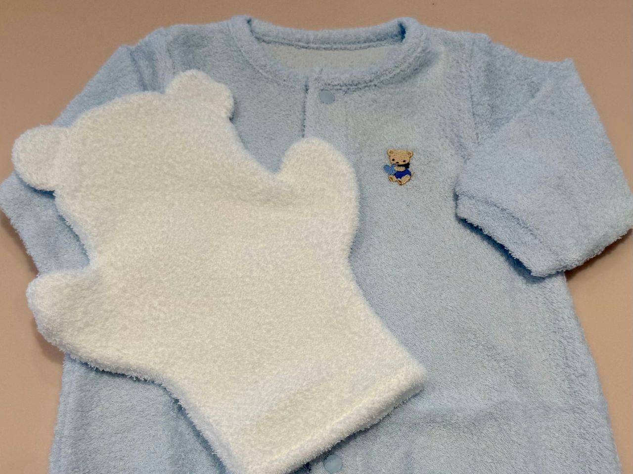 パペットの土台はファミリアのベビーウェアなどにも使われているオリジナルの「スリーピーパイル」を使用しており、とてもやわらかく心地良い肌触りです。