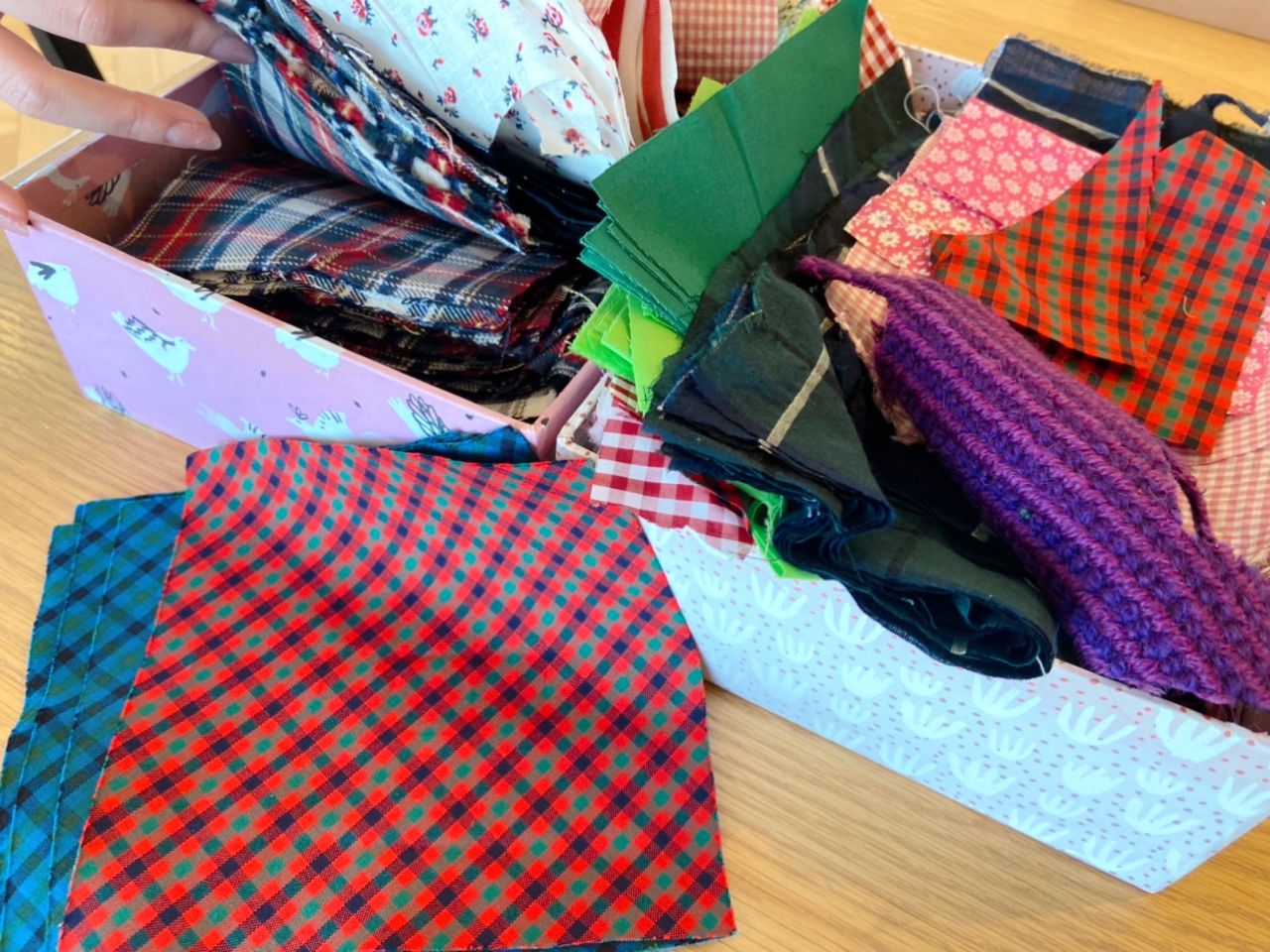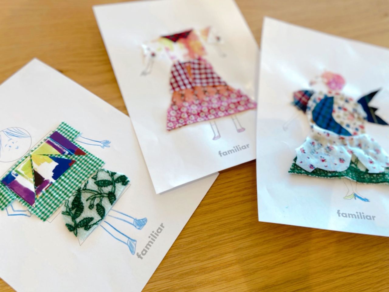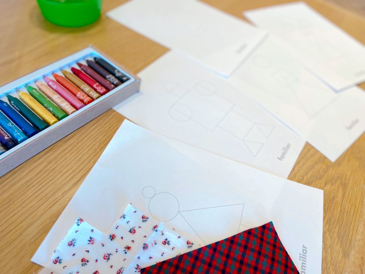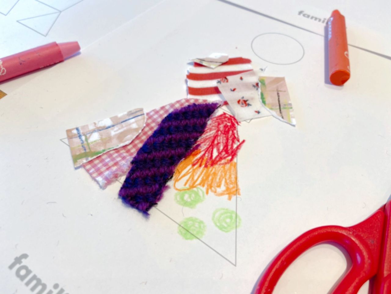 ○△□の様々な組み合わせのシートに、自由に色をぬったり生地を貼って空想のファッションをデザインしてみましょう!