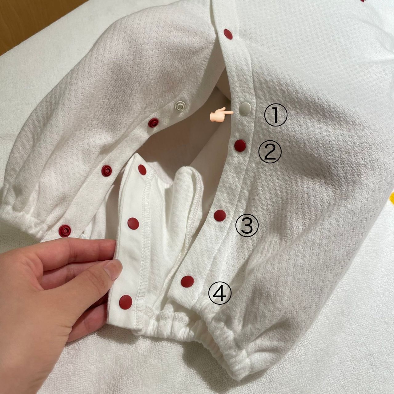 下4つのスナップを外して、後身頃のスナップ3つは合わせて留めます。