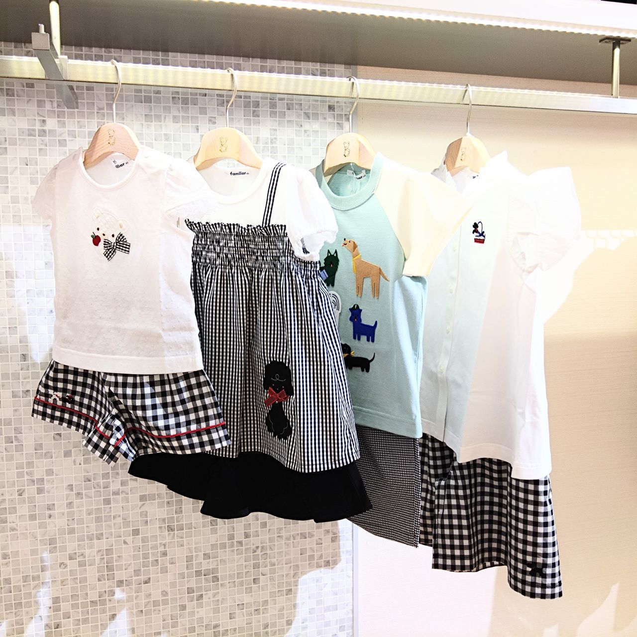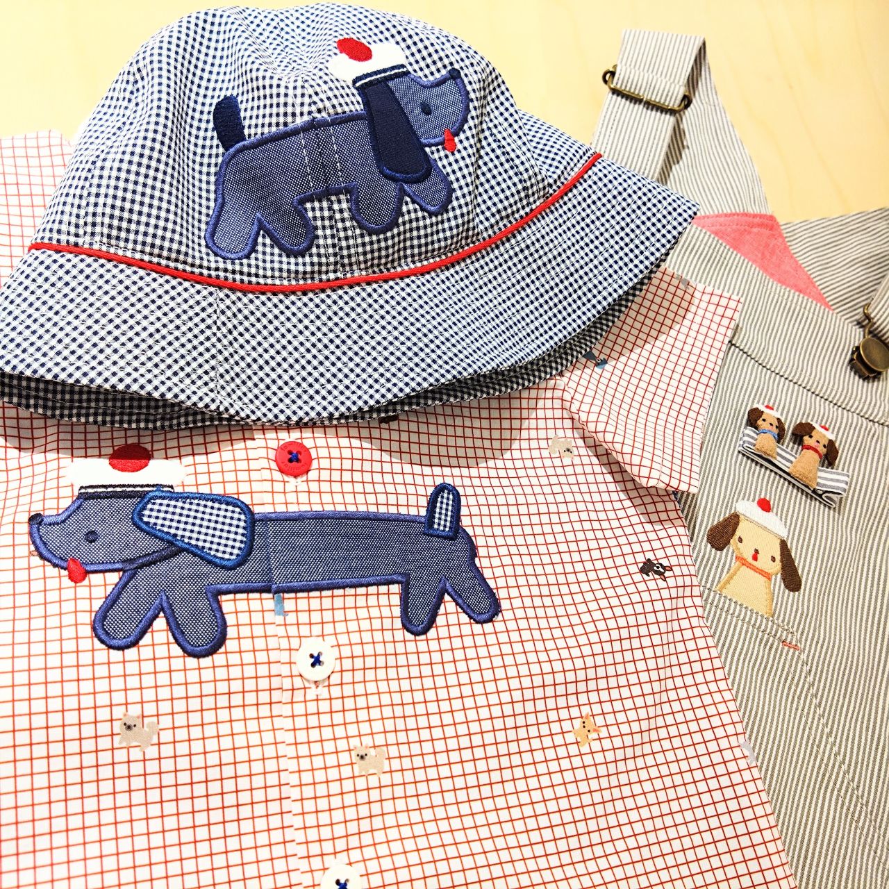 こちらは共通したひょっこり顔を出したわんちゃんがデザインされたお洋服を主役にコーディネート。