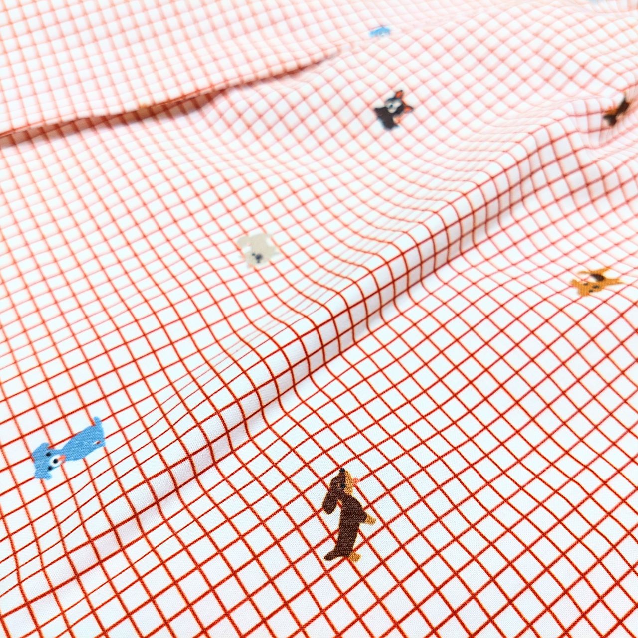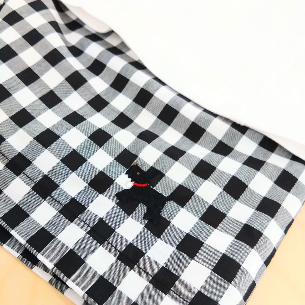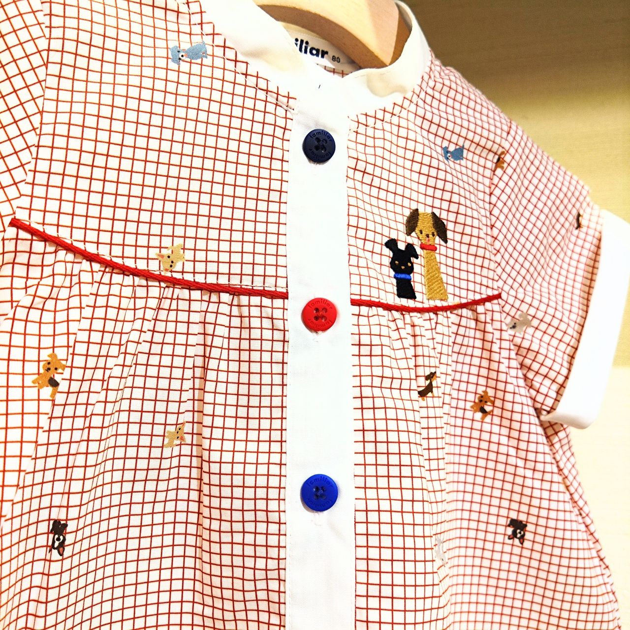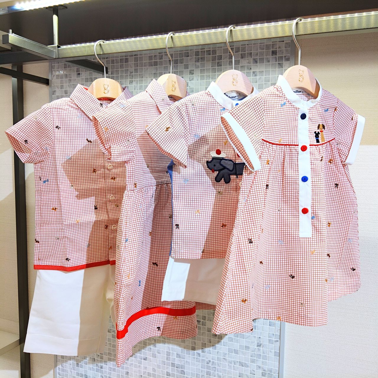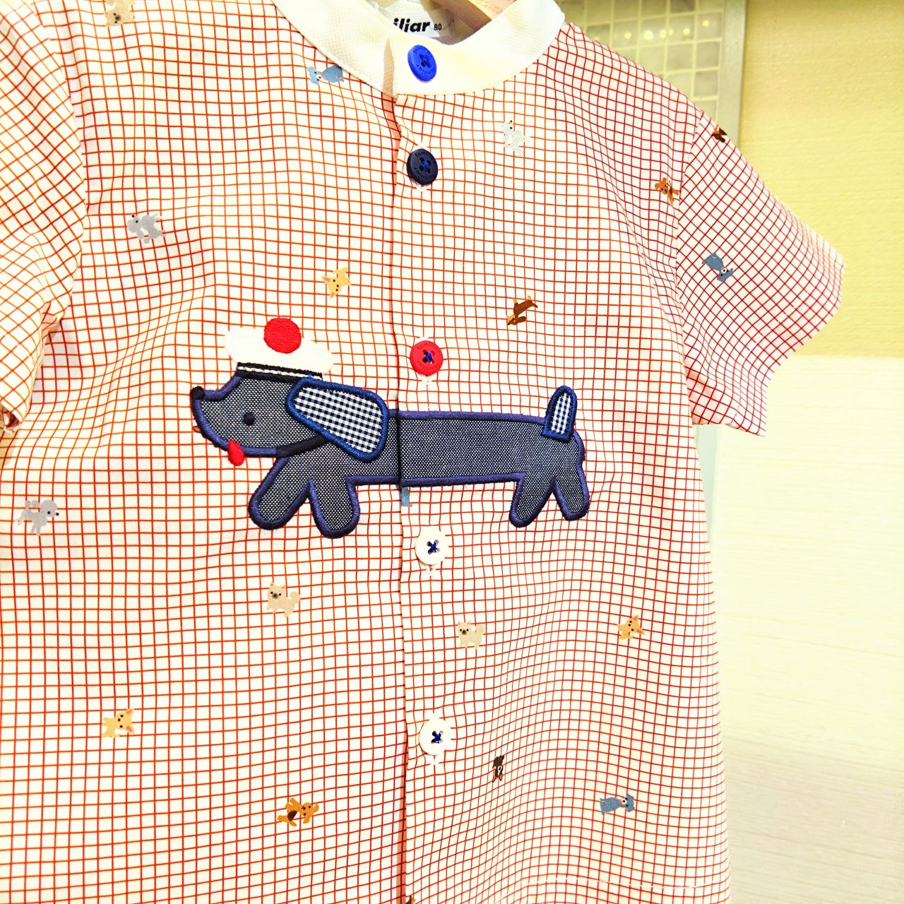 すべてに使用しているこの、グラフチェックにわんちゃんがたくさんの生地はファミリアが別注した特別の生地!いろんなわんちゃんがプリントされてるのでじっくり見てほしいです♪