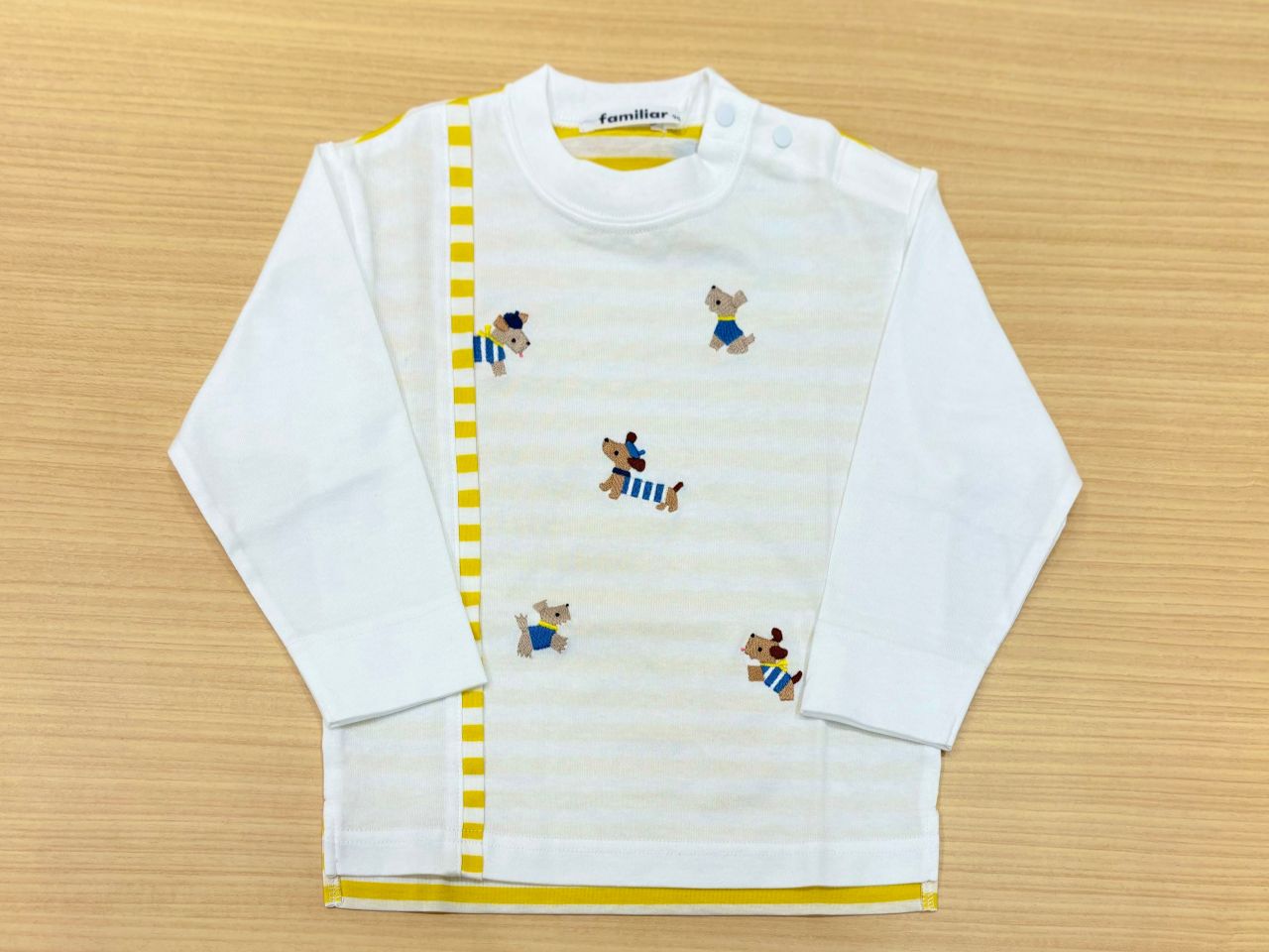 黄色×白色のボーダーがさりげなくポイントになっており、背面も切り替えしでボーダーになっているTシャツです。