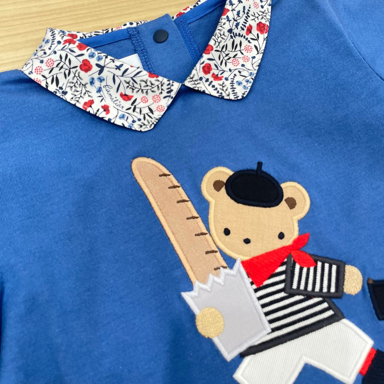 Tシャツは襟元にさりげないリバティ柄で可愛らしすぎず、フランスパンを持っているクマちゃんのオシャレ感がGOOD。