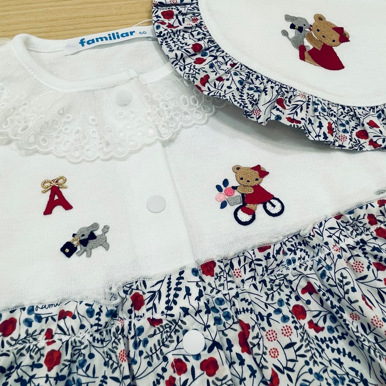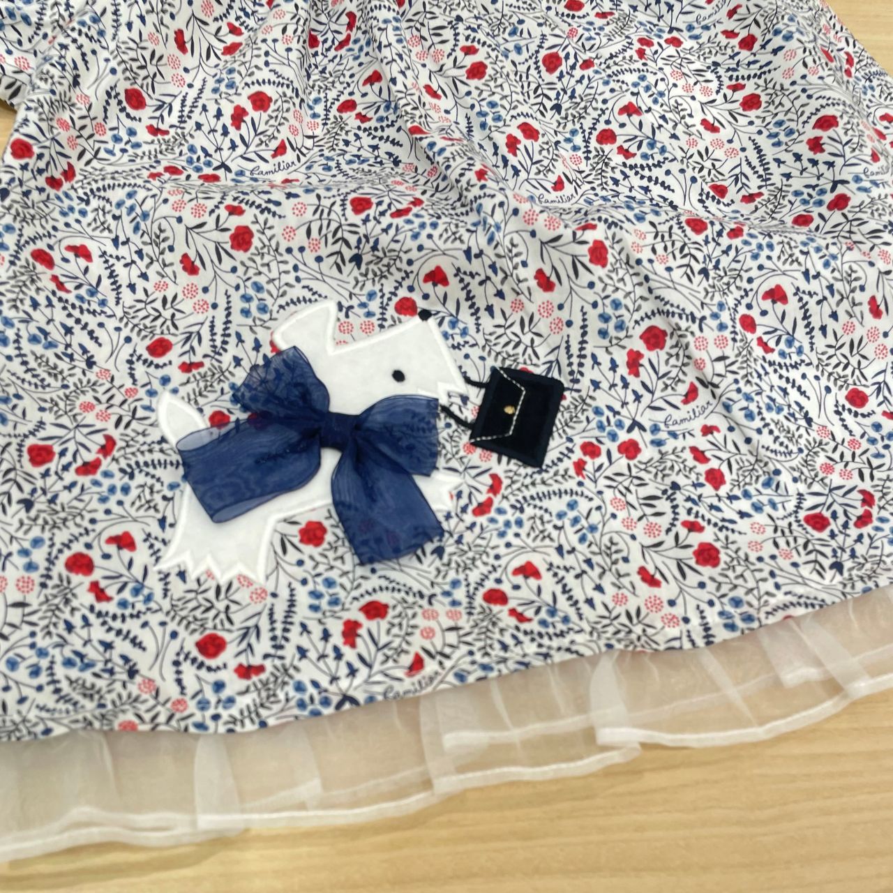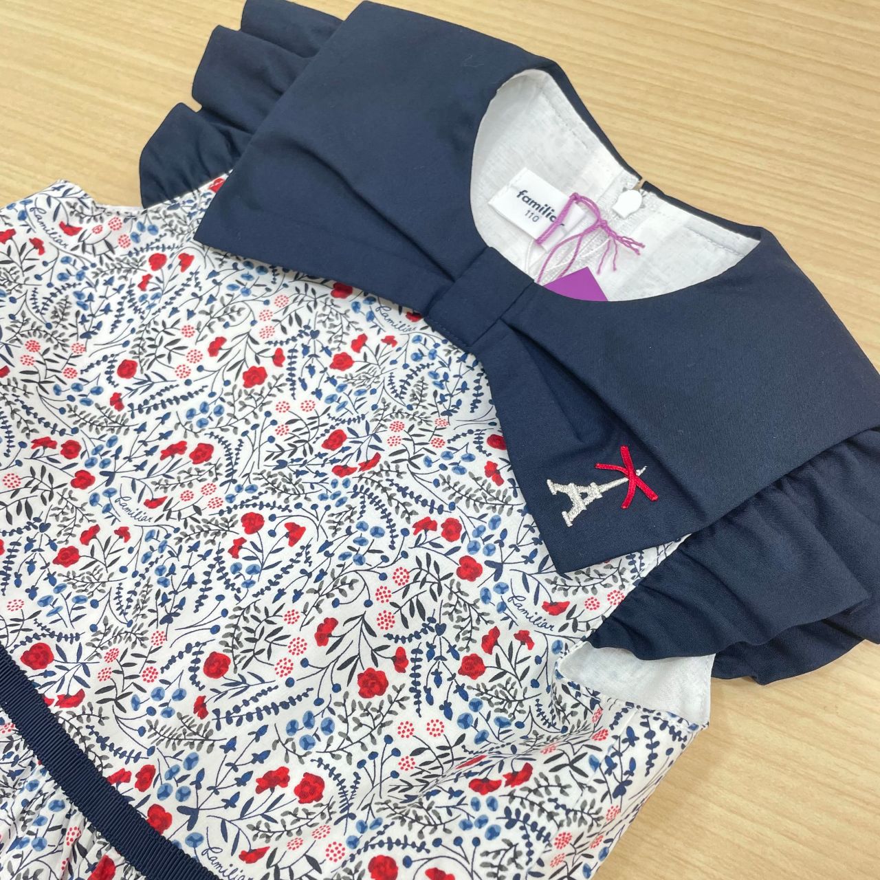 ワンピースはリボン型の襟にエッフェル塔の刺繍が可愛らしいです!フリルのある袖も上品でお出かけ用にぴったりですね。