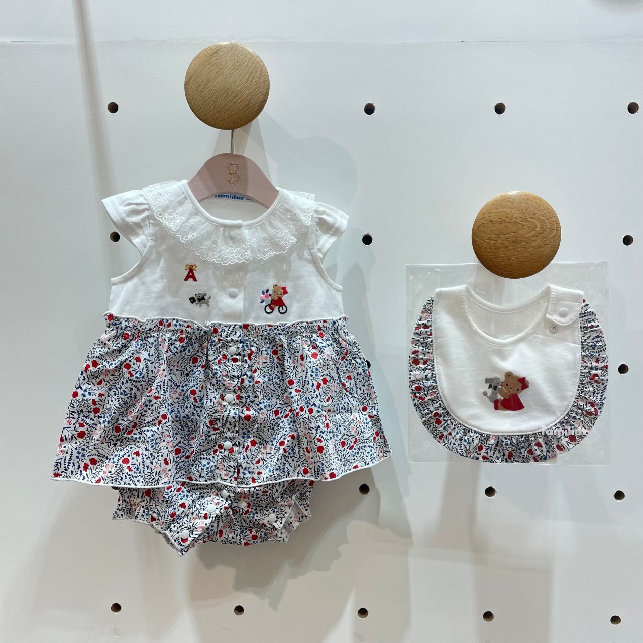 袖付きロンパスはリバティ柄に合わせて、自転車の前カゴにお花をあしらっています!フリルもたっぷりで可愛いですね♪