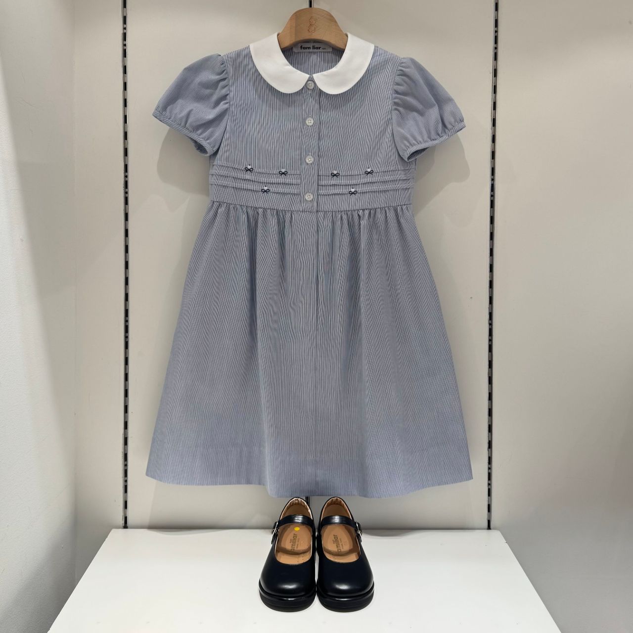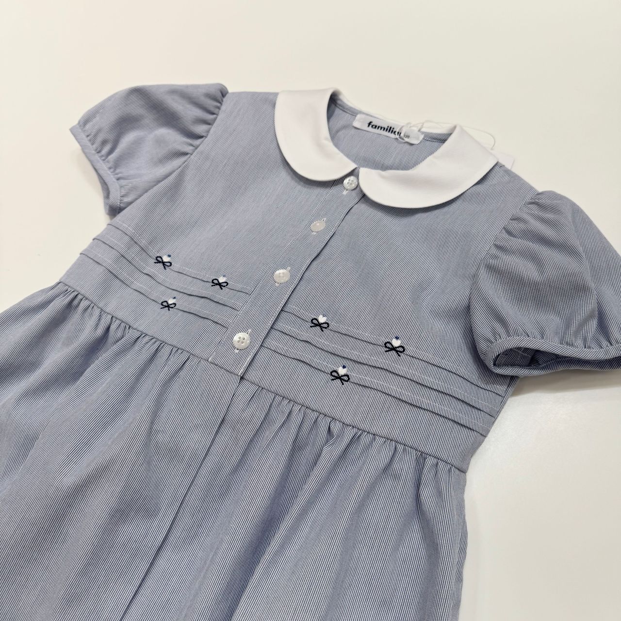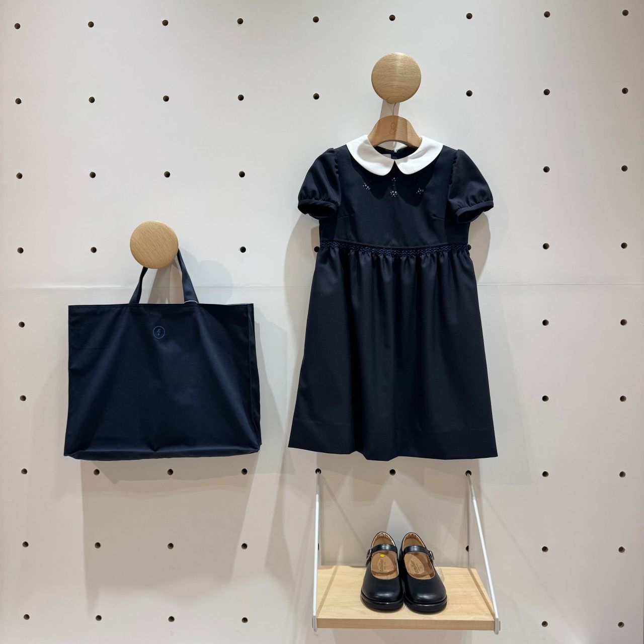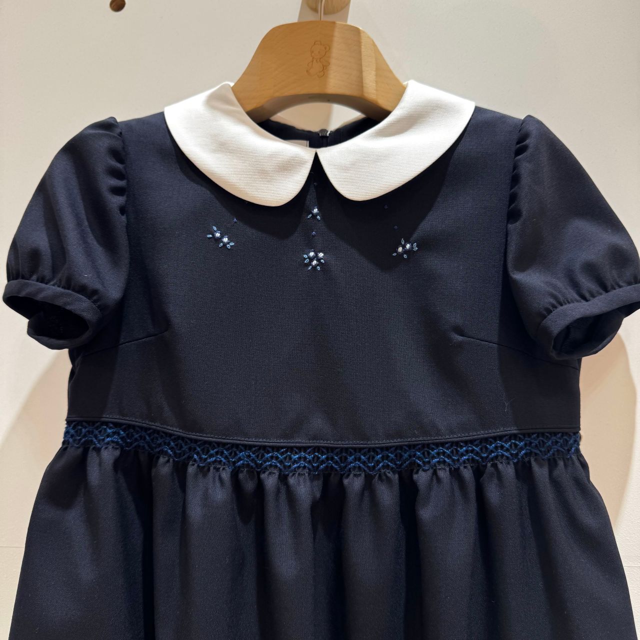 こちらのワンピースは濃紺でとても締まって見え、そして手刺繍とスモッキングが施され、とても上品な仕上がりとなっています。