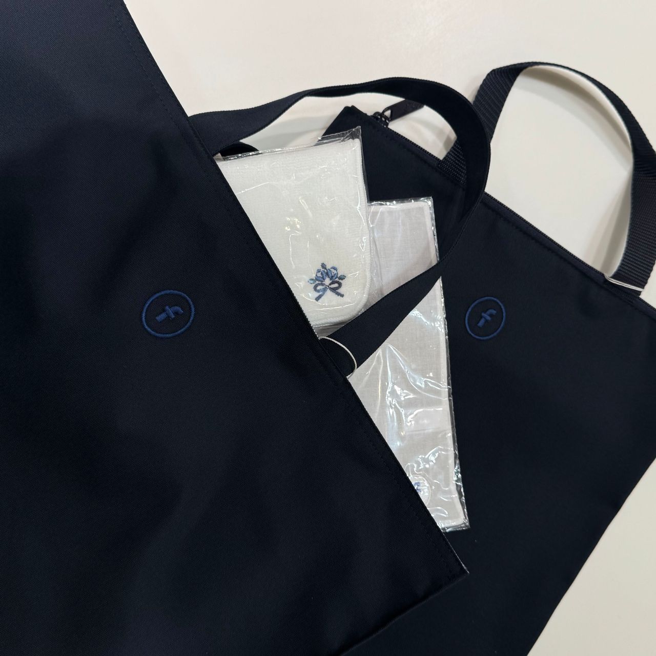 学校訪問時にあわせて、A4サイズの入るマチ付きのバッグ(200101)やシューズケース(200102)、ハンカチ (200301)(200302)があり、それぞれ f・お花・車の3種類の刺繍がございます。