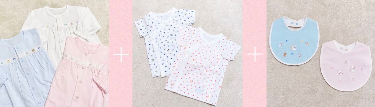 何を揃えればいいのか分からない・・・という方にはお洋服・肌着・スタイのお得なセットがございます!お好きなカラーを選んでくださいね。