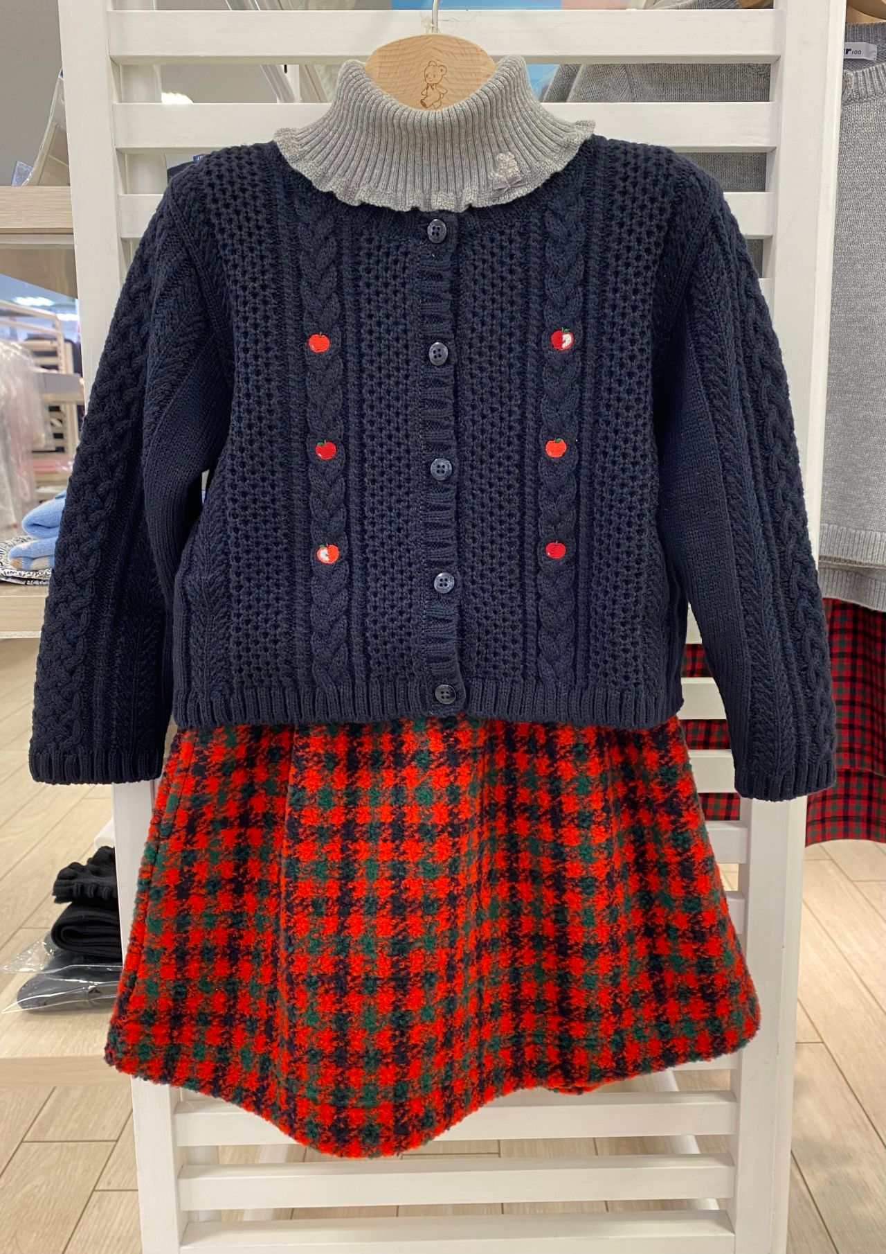 リンゴのモチーフやお袖のフリルがポイントです。