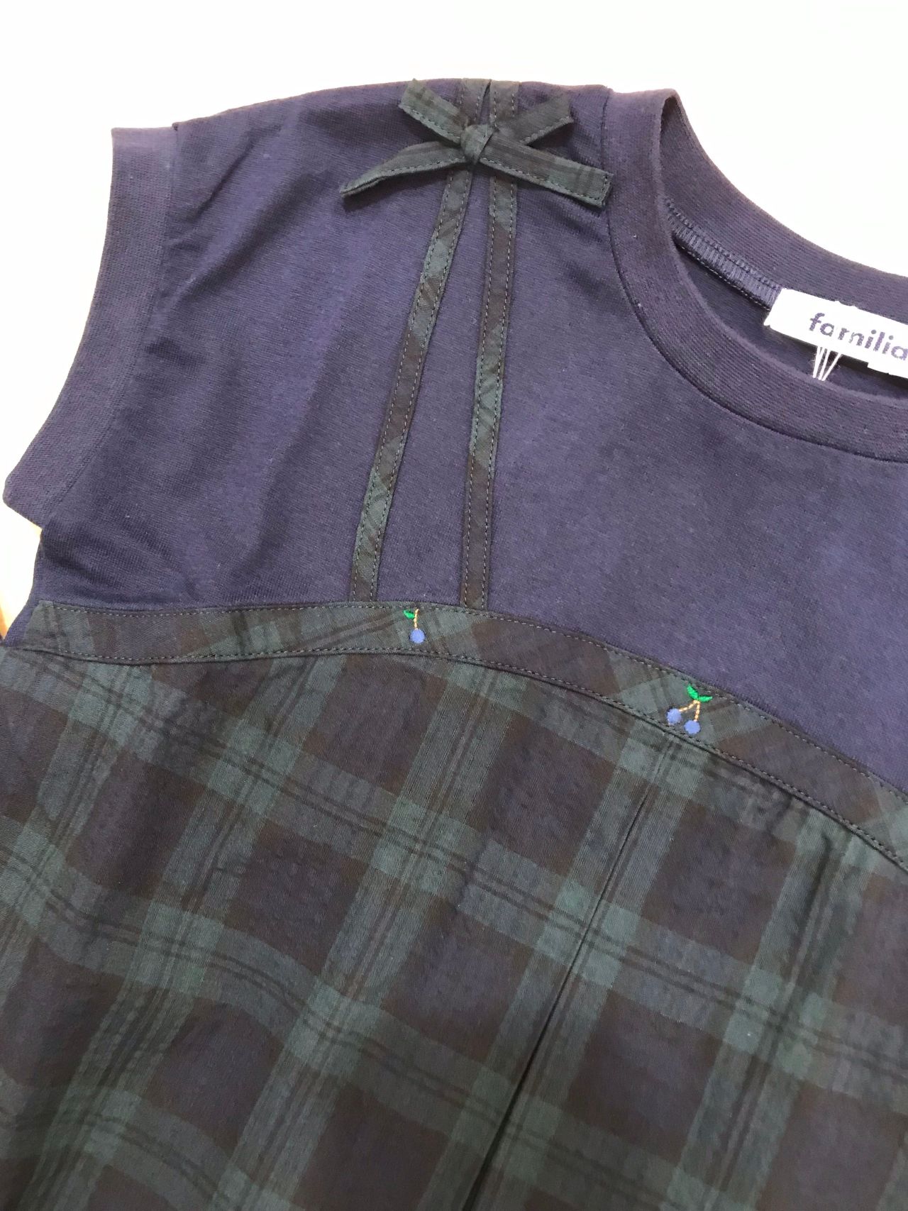 ブラックウォッチと青いチェリーの組み合わせがお姉さんスタイルに合わせやすいですね。