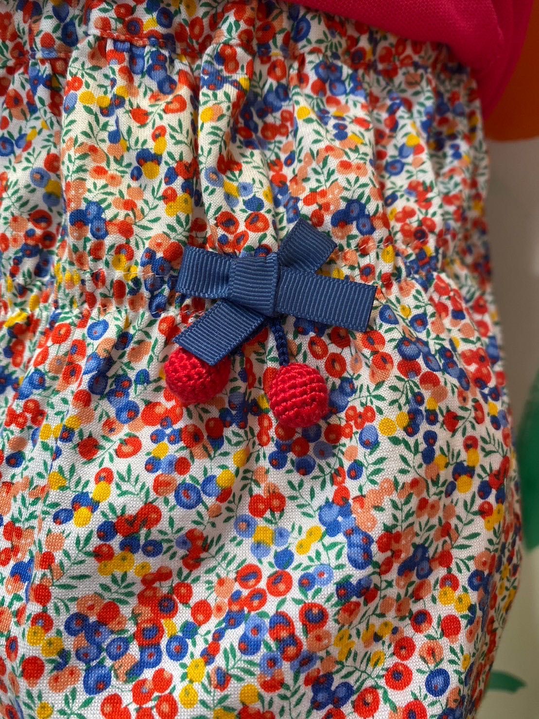 夏にぴったりなポップカラーTシャツとリバティ柄のキュロットコーディネート。