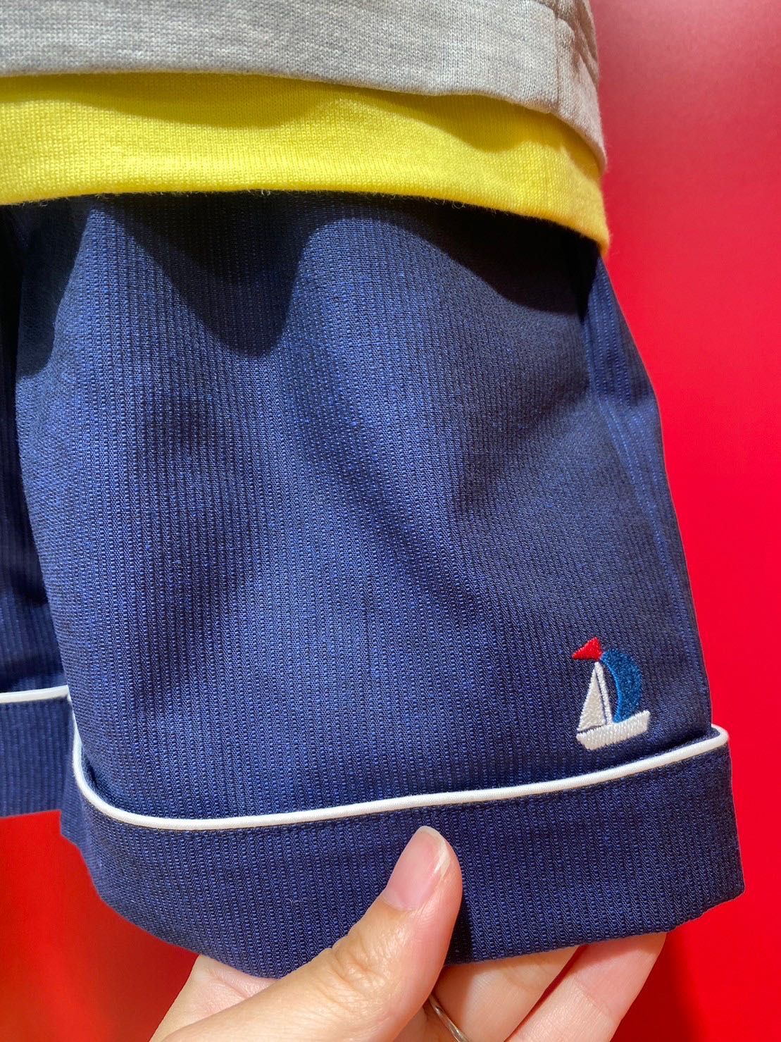 重ね着風のデザインTシャツとマリンパンツのコーディネート。