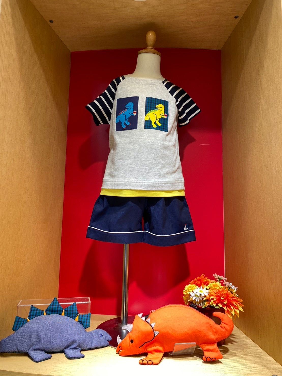 裾のイエローと同じカラーの鮮やかな恐竜アート!