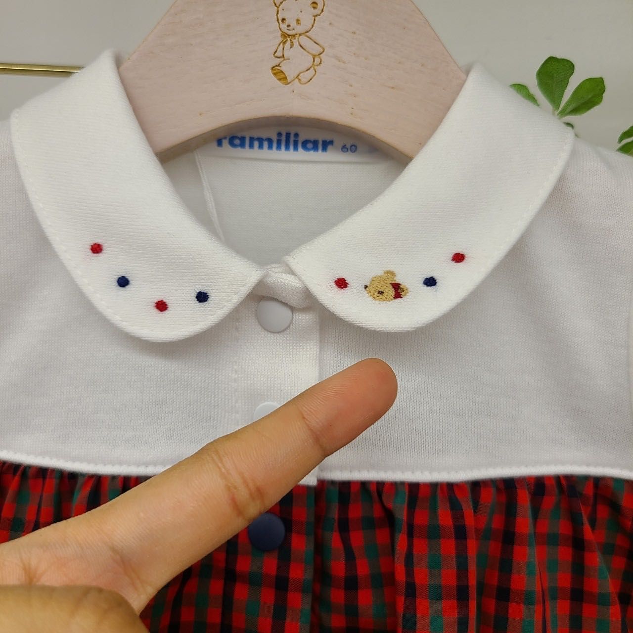 胸元のさりげないファミリアチェックが素敵!