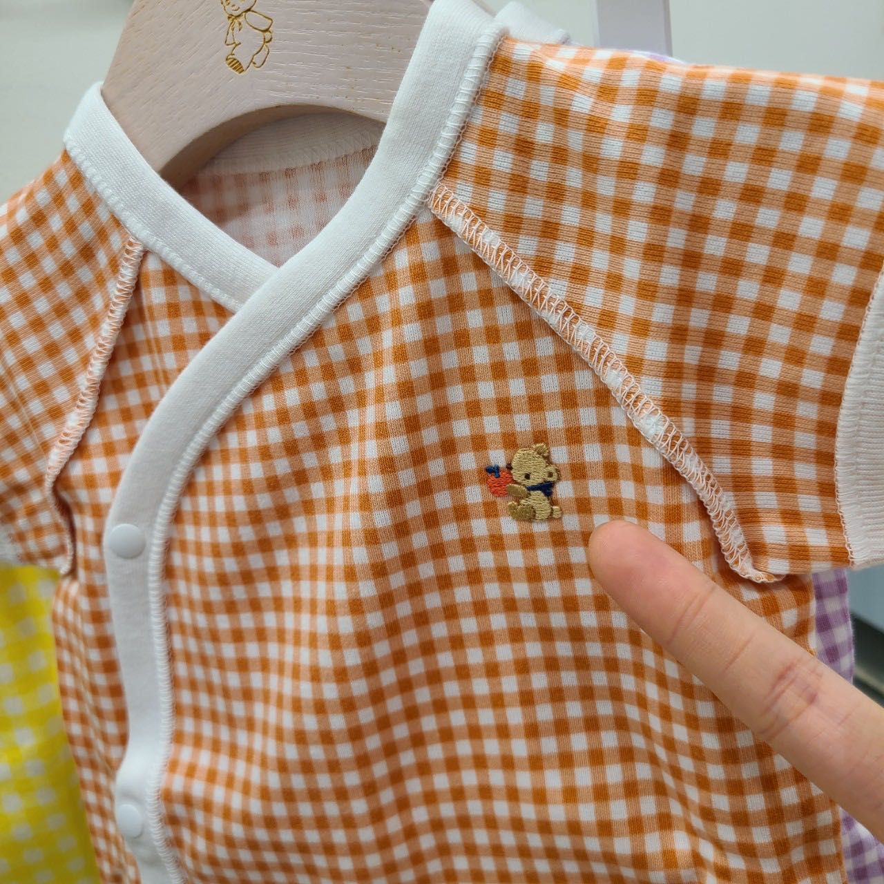 オレンジとパープルの2色展開でくまちゃんのアップリケがポイントです。