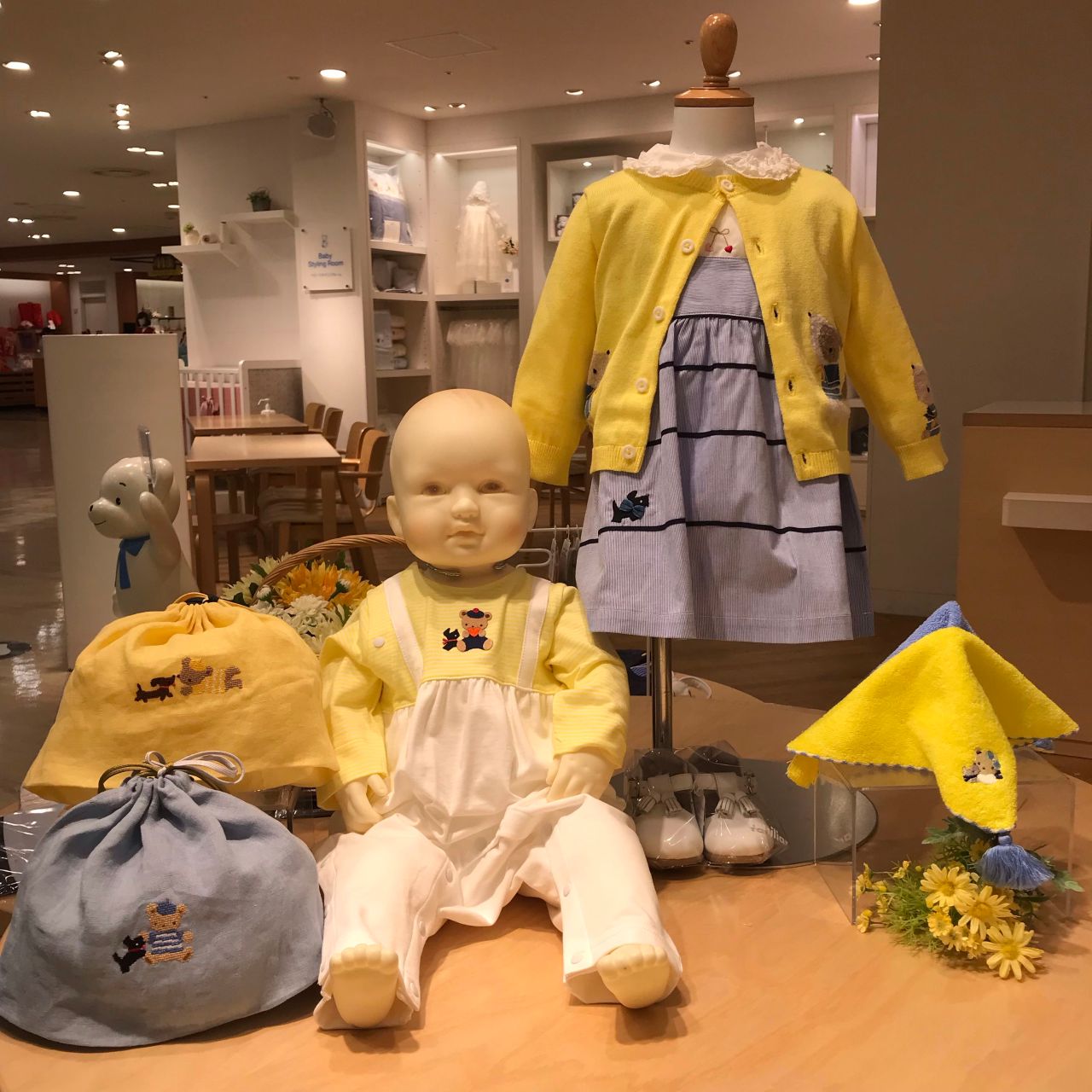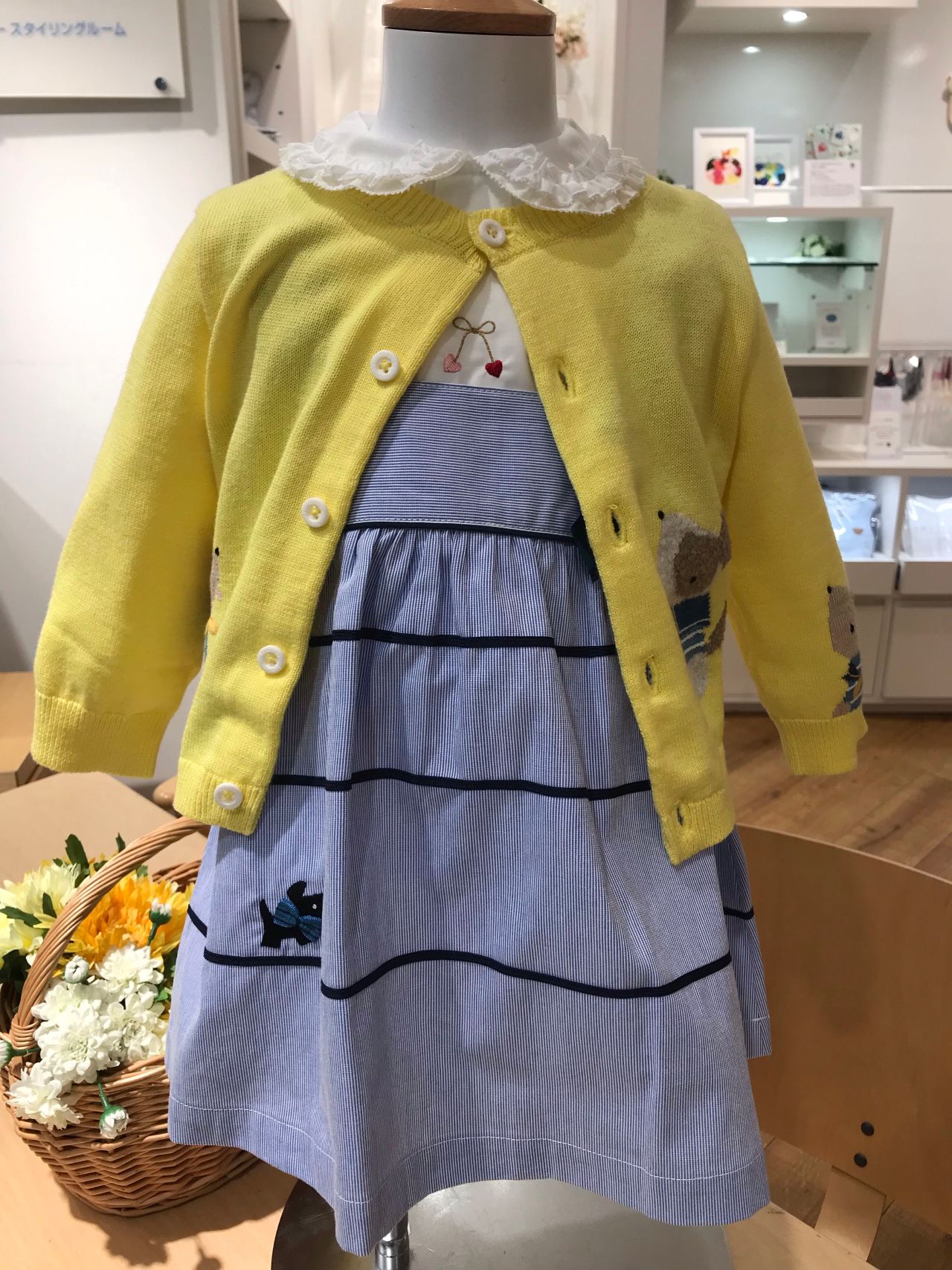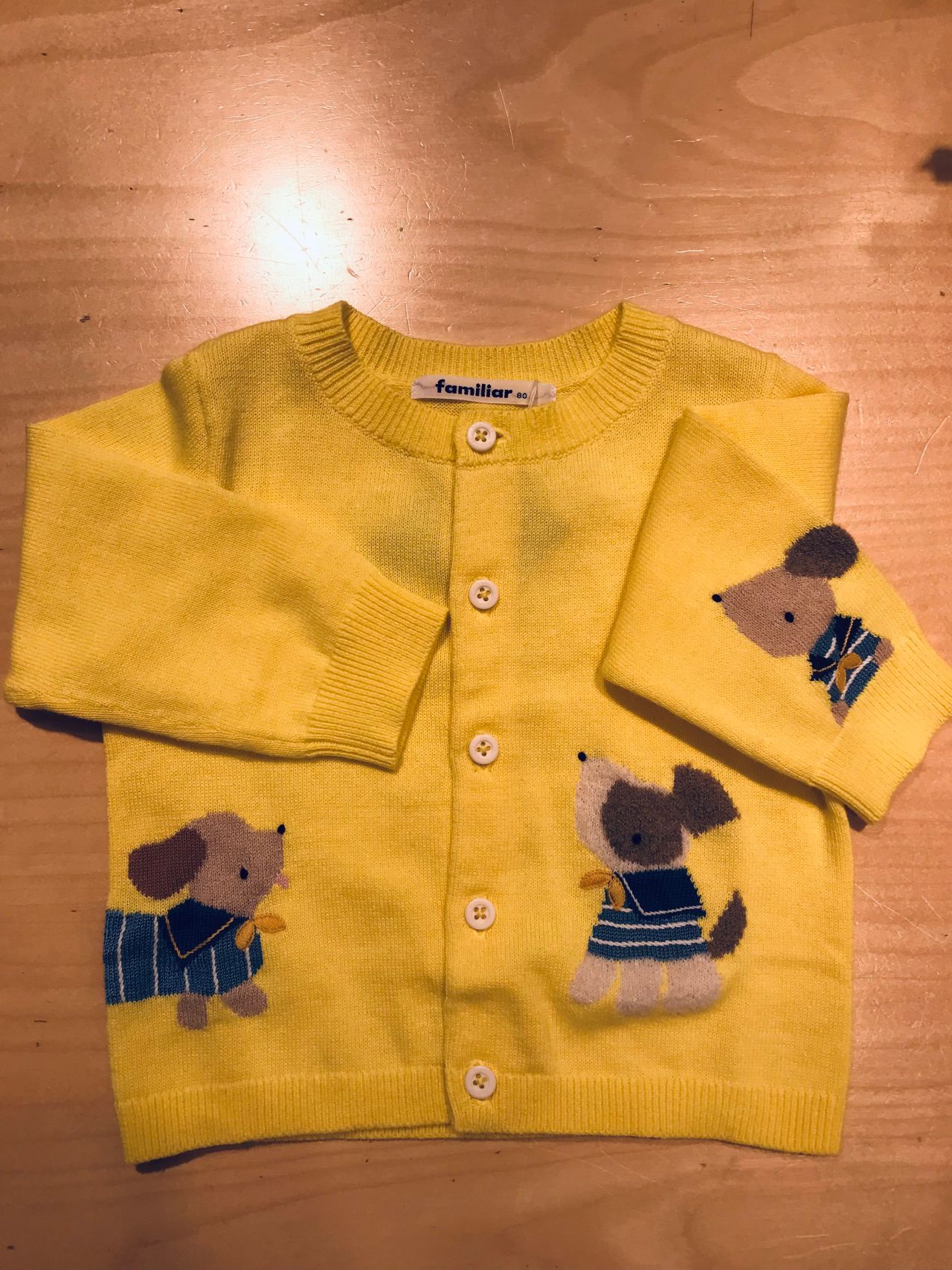 春らしいイエローのカーディガンにワンちゃんがたくさん!