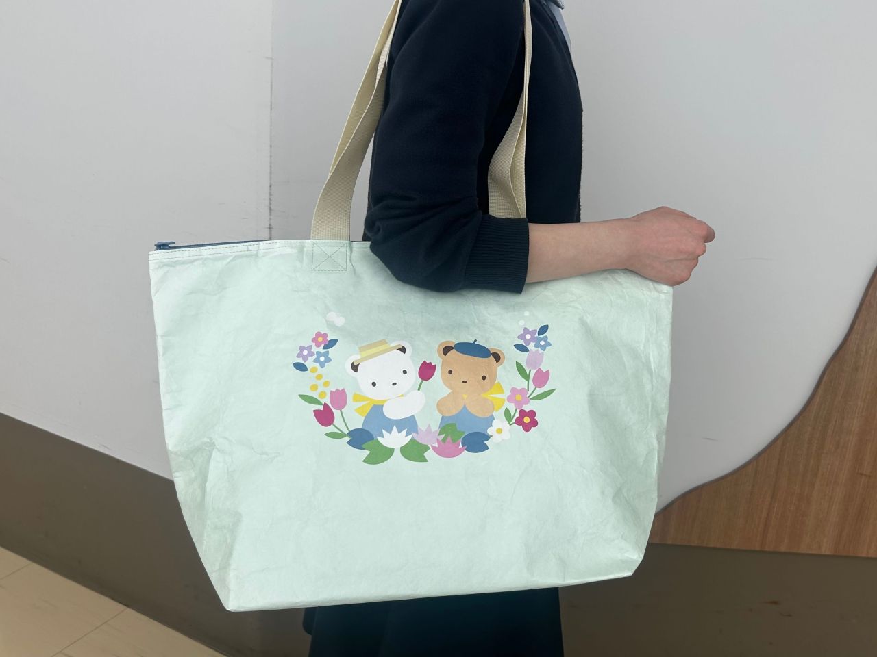 クマちゃんとカラフルなお花が描かれた、春らしくてかわいいデザインになっています。