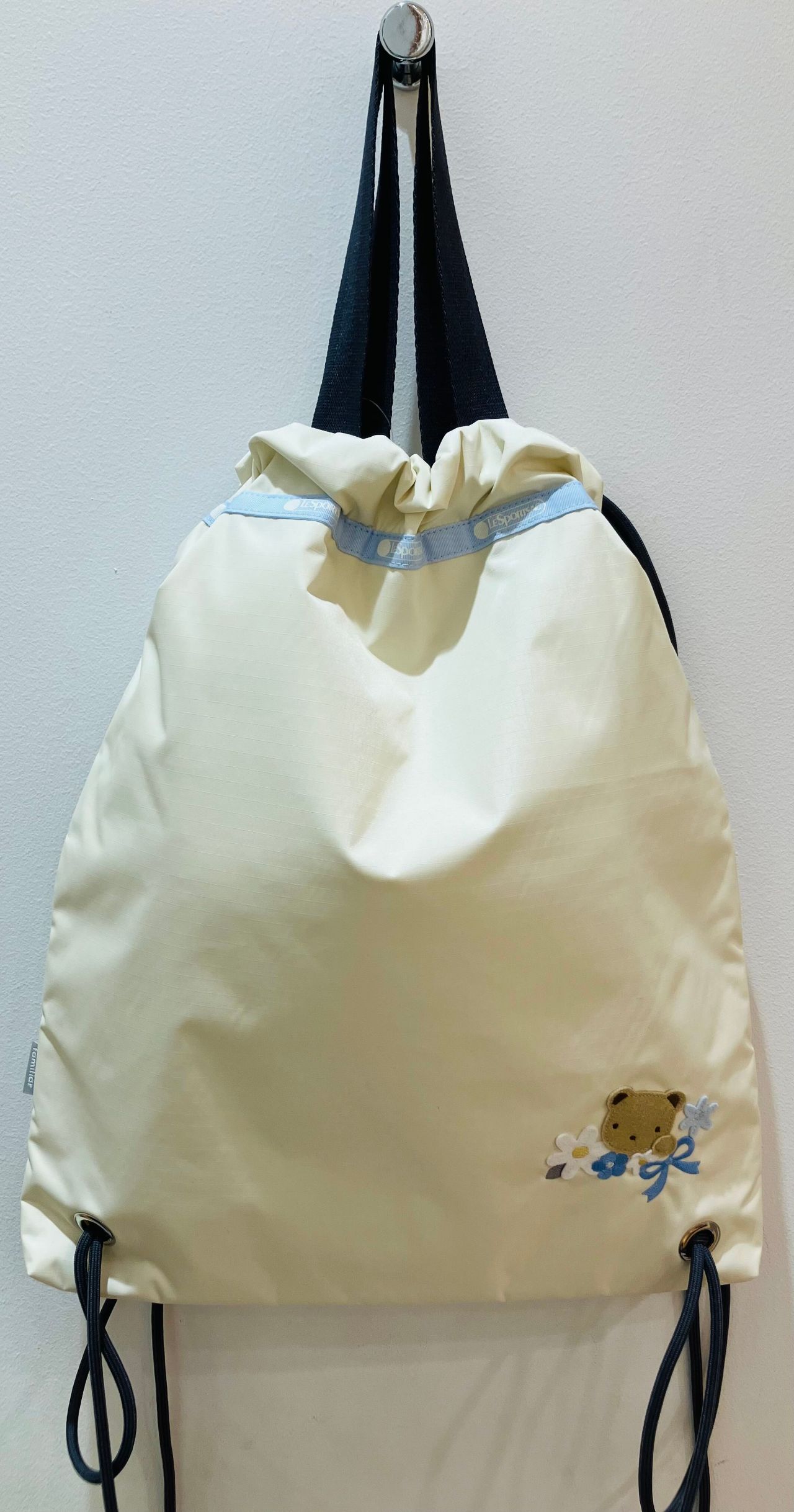 どんなお洋服にも馴染むアイボリー色のナップサック。生地が柔らかくとっても軽いんです♪