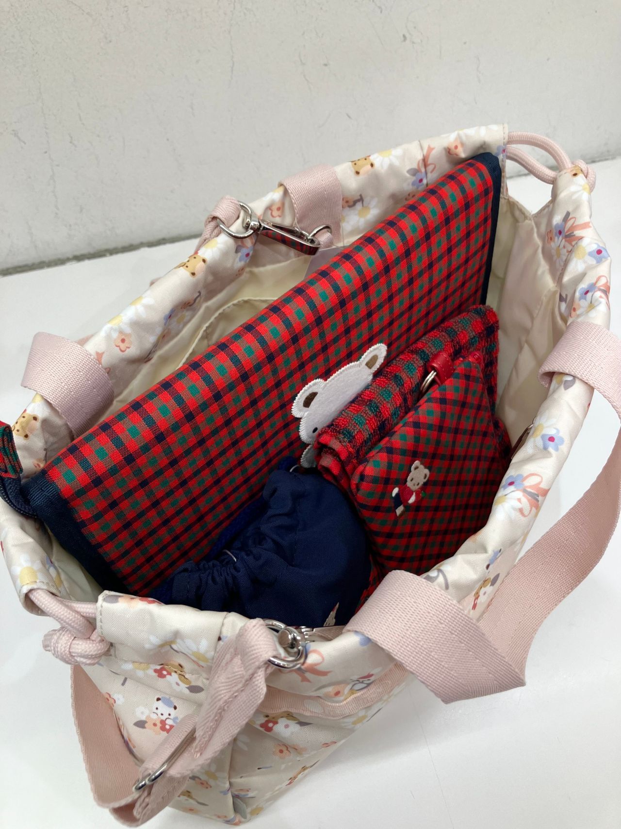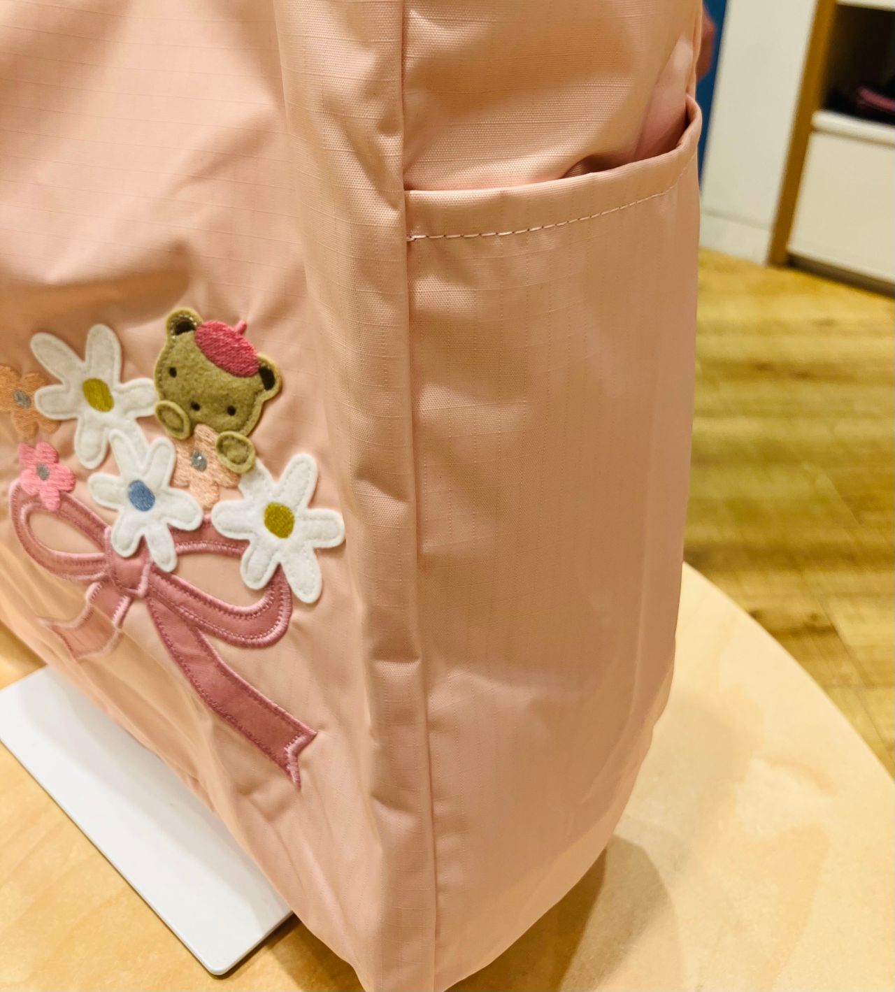 春らしいピンクが可愛い大きめトートバッグです♪ひっくり返すと今回のコラボレーションのために作られた総柄プリントです✨サイドにポケットがあるので、便利ですね!