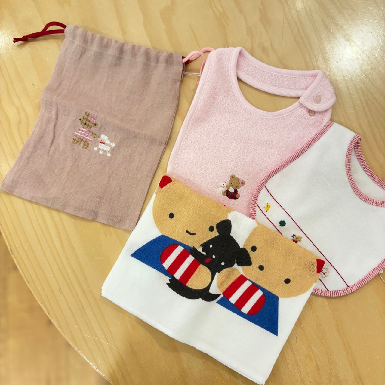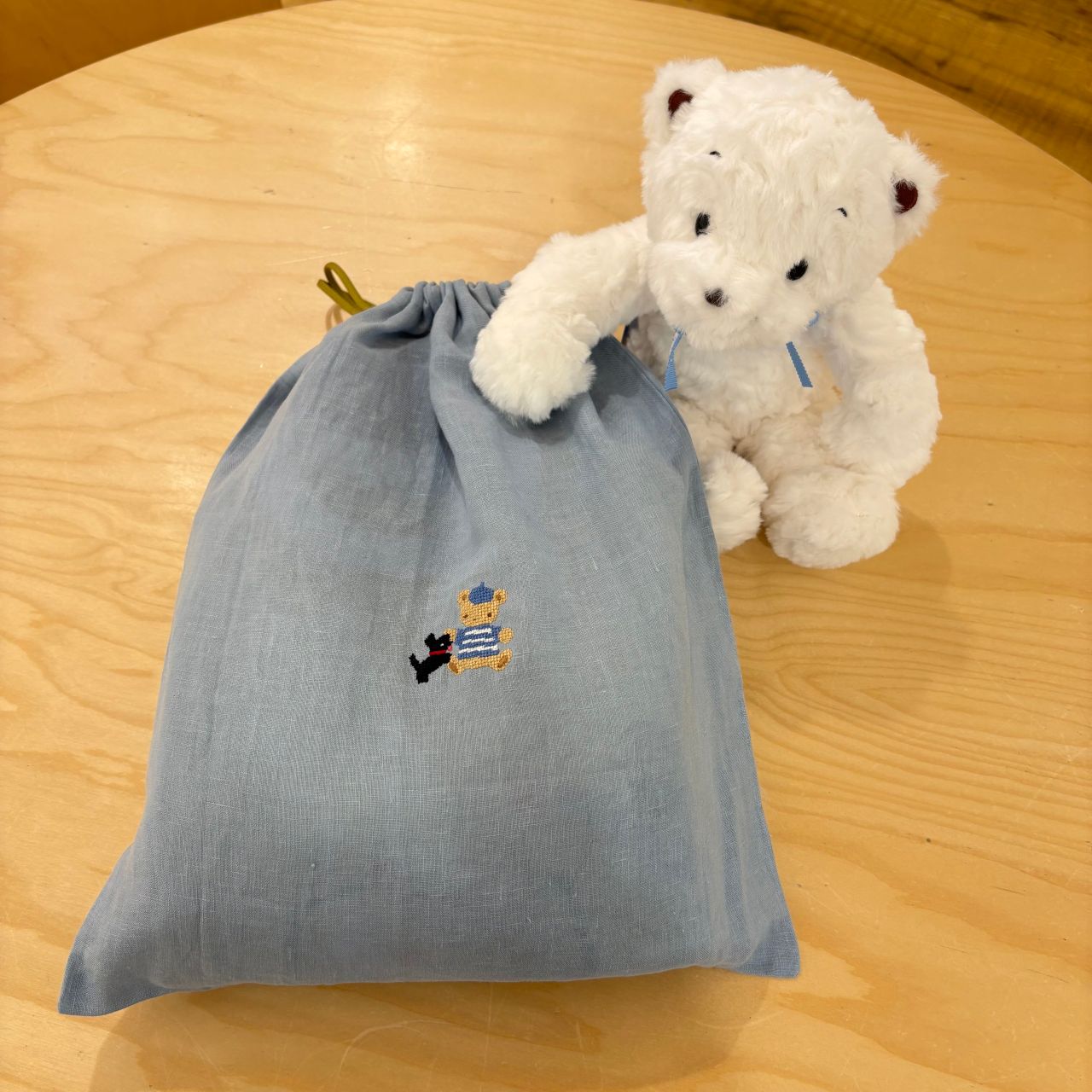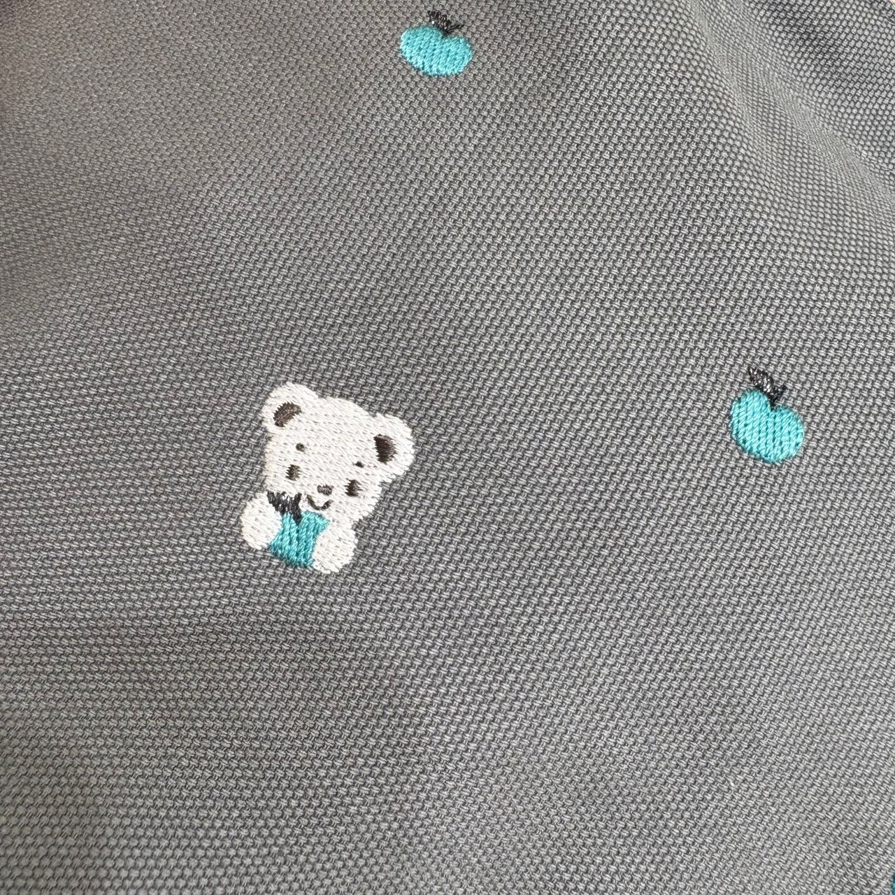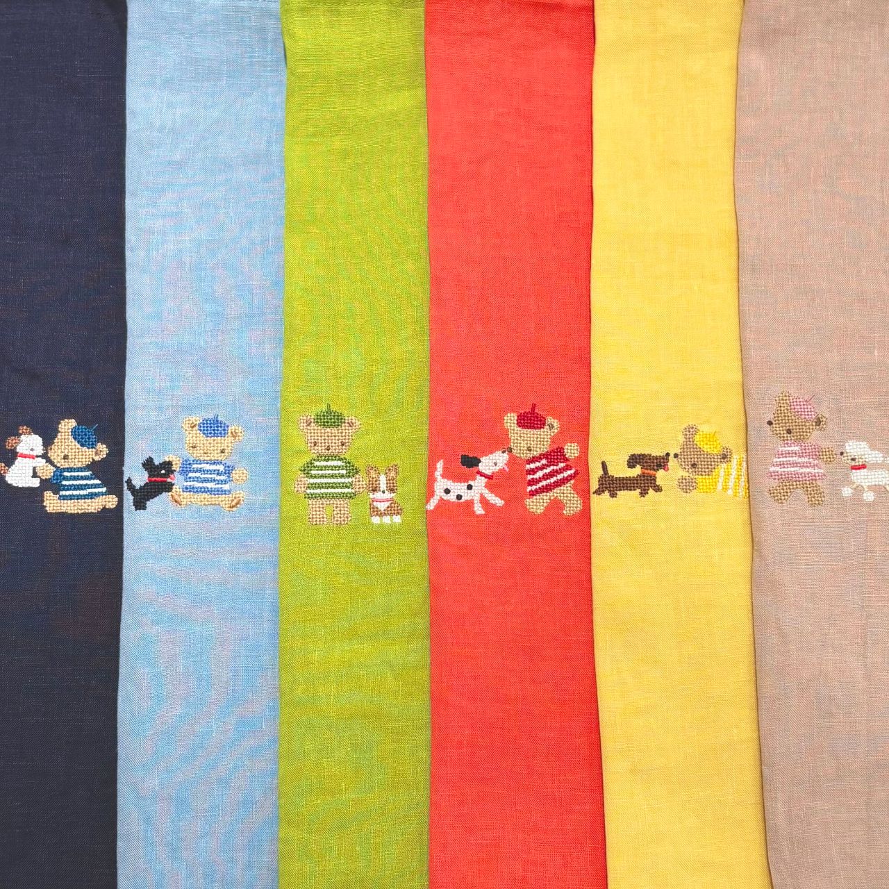 クロスステッチ風の刺繍は、生地の色に合わせてクマちゃんたちのお洋服の色を変えているのもポイントです