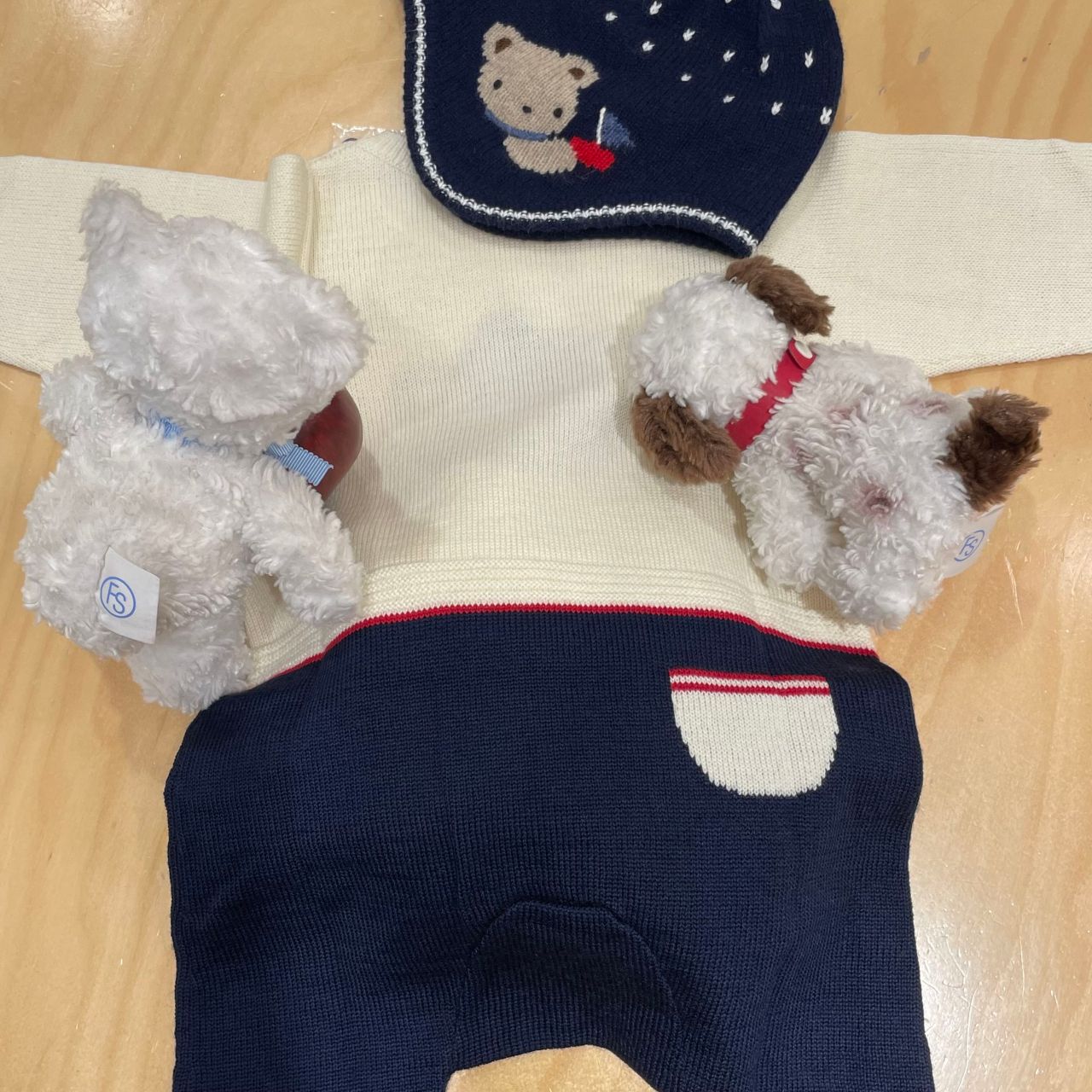 こちらは、クマちゃんのセーターを着ている風のアートをインターシャ編みで表現したカバーオール