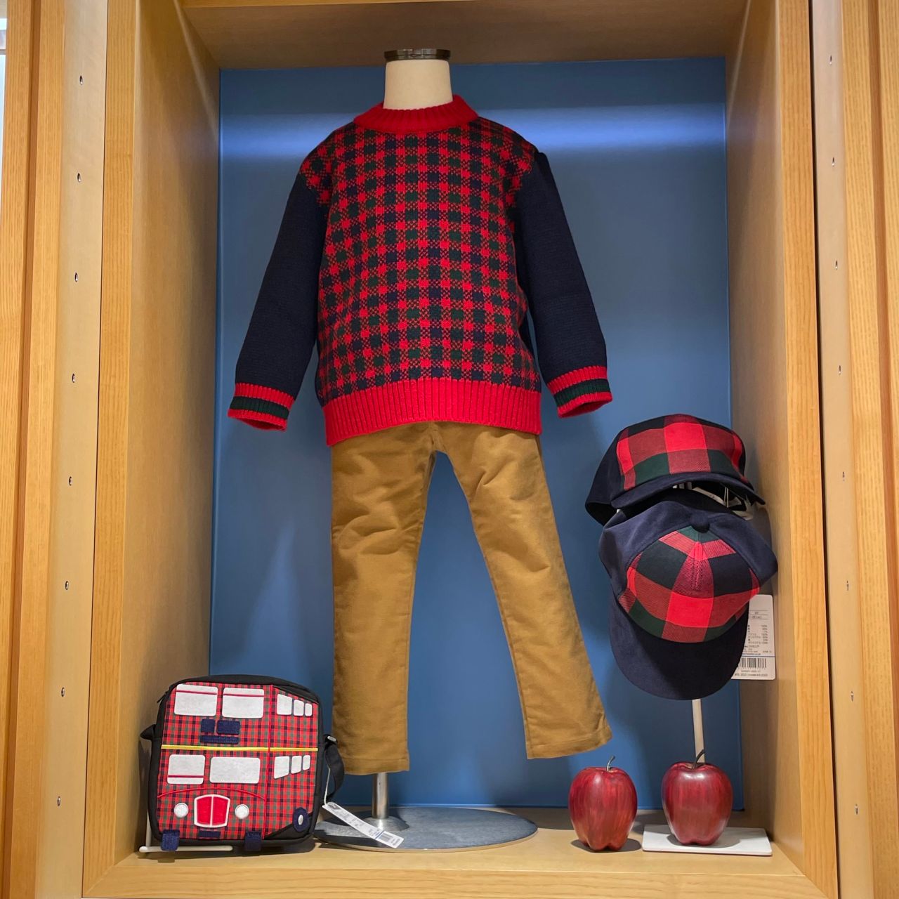 大きめの赤系ファミリアチェックをジャガード編みで表現したセーター。
