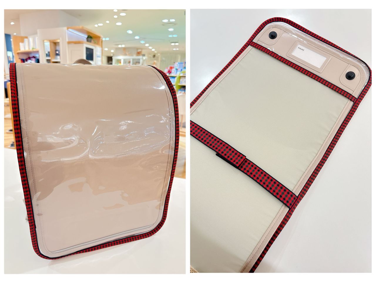 本体カラーを活かせるよう、かぶせ部分が透明のPVC生地を使用。ファミリアチェックのパイピングデザインがポイントです。