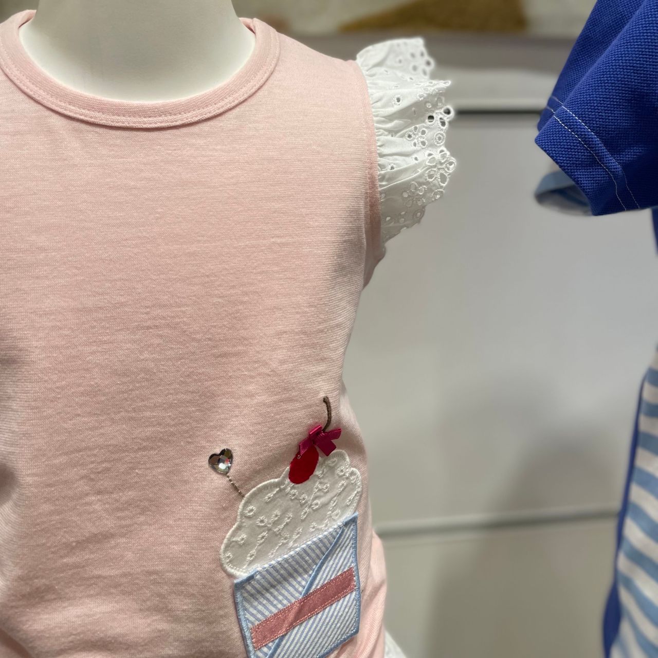 カップケーキのアップリケは、ポケットになっています。レースやリボン、ハートのラインストーンなどディテールもこだわっています。立体的でとっても可愛いです♪