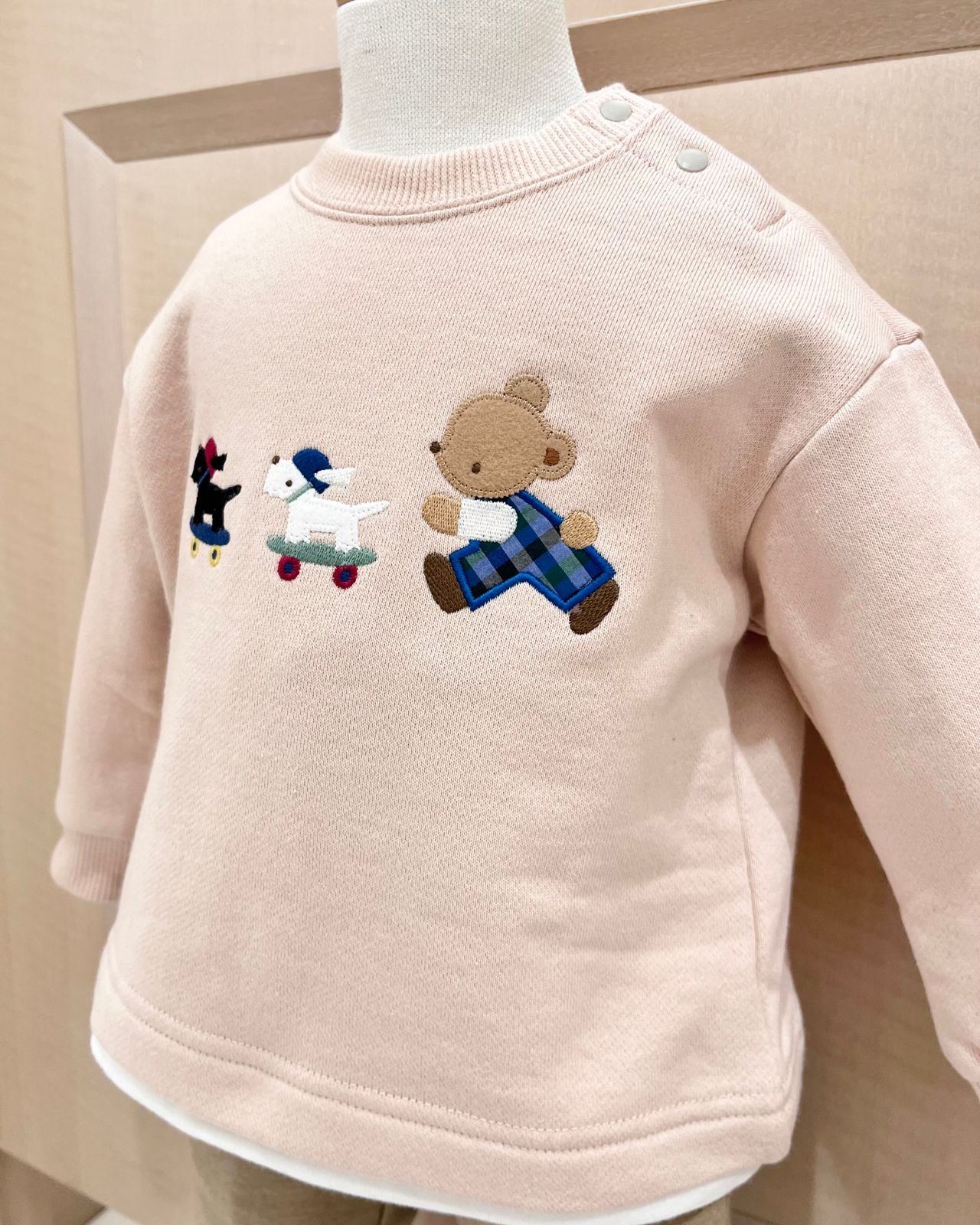アートのクマの洋服と、肩明き見返しにシャンブレー調の青系チェックを使用しています★